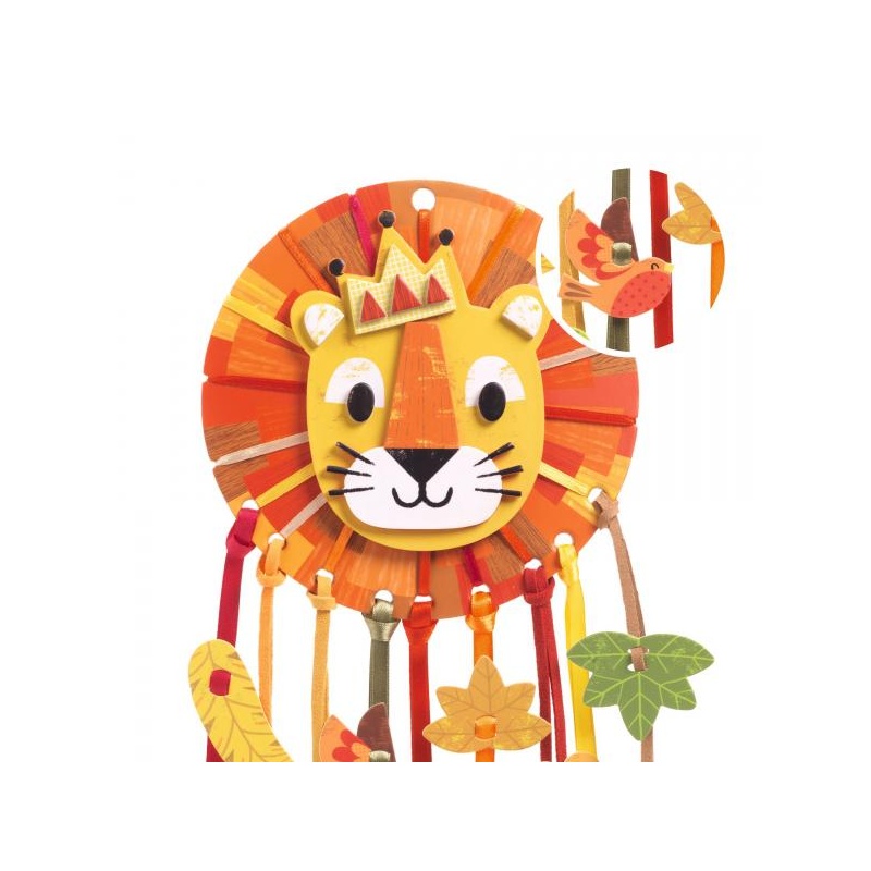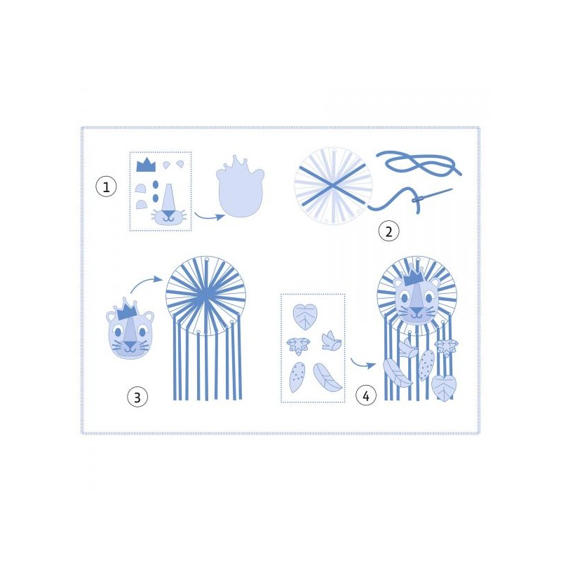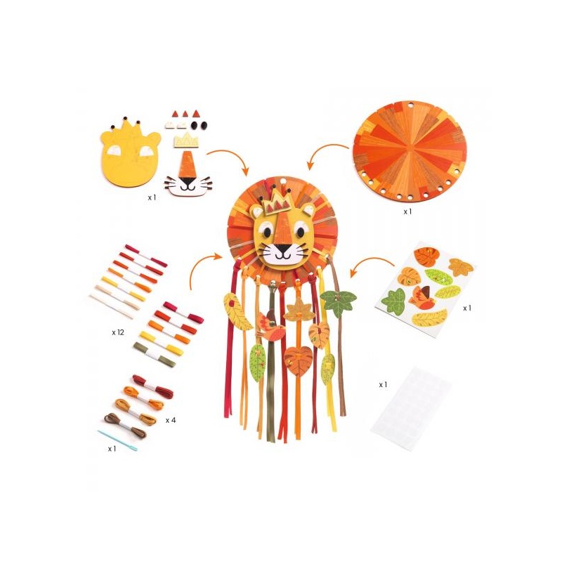 A creative kit specially designed for young children aged 4 and over to make a pretty dream catcher (15 x 40 cm). Children decorate the lion with the colourful ribbons and cords, then use the thick stickers to decorate the stand. A beautiful decorative item that can be hung in a bedroom to chase away bad dreams. A 2 in 1 product: a fun crafting activity and a reassuring object to help children with a fear of the dark. Pre-cut pieces and a range of stickers provided for glue and scissor-free assembly. Helps develop fine motor skills. Instructions provide step-by-step creative tips. Contents: 1 thick pre-punched card stand, 10 thick card stickers, 1 assortment of colourful velvet and satin ribbons, 1 sheet of 8 illustrated pre-cut pieces, 1 plastic needle with a round tip, 1 sheet of adhesive pads, 1 set of instructions. FSC® certified paper and card. Suitable from 4 years. Warning! Not suitable for children under three years, choking hazard due to small parts.