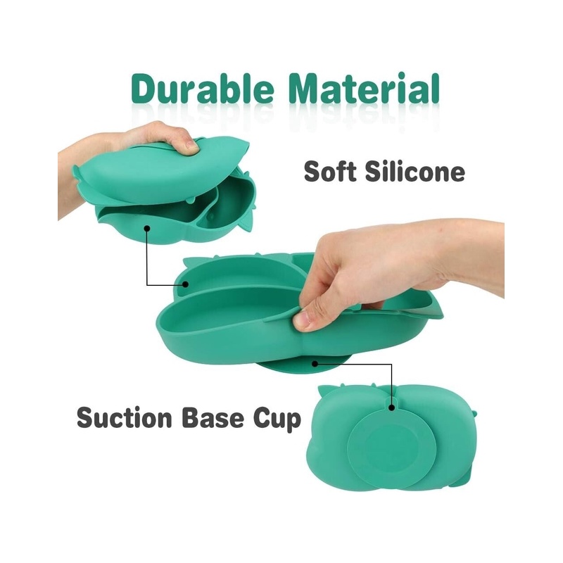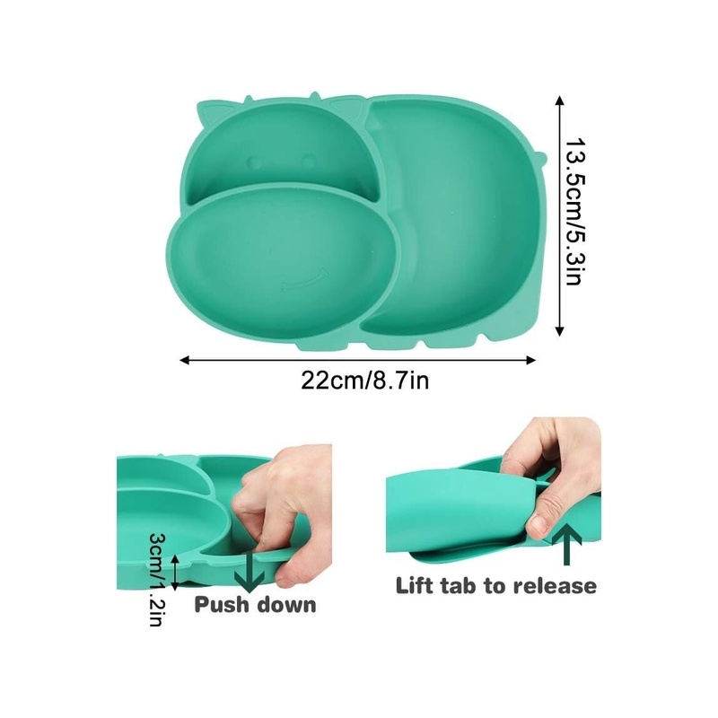 Cute design: The silicone baby plate has a cute cow shape and 3 compartments to separate food. The edge of the plate prevents food from leaking and spilling, which is very convenient for children to learn to eat.
