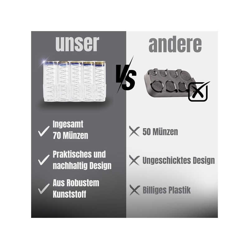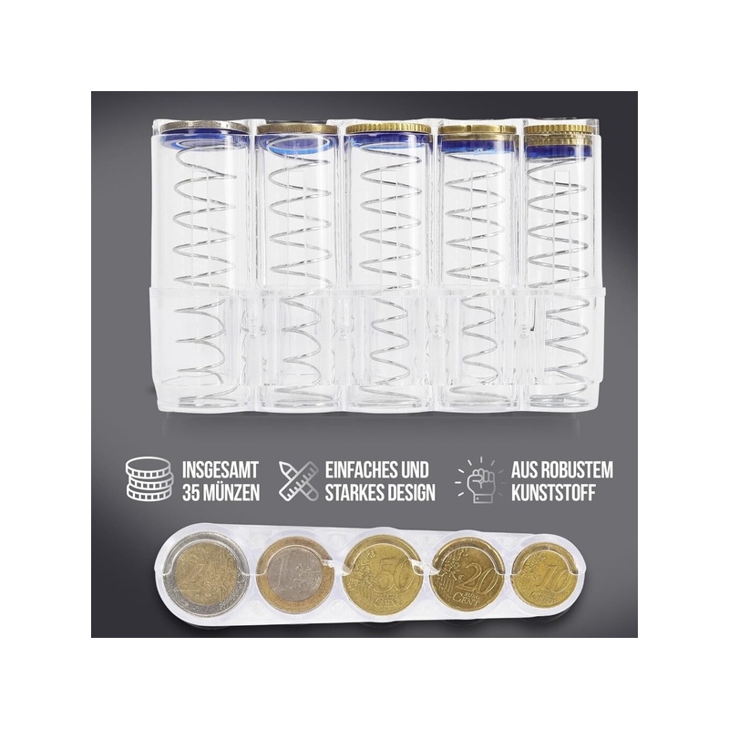 The coin box with 5 coin sorters is ideal for storing change. From 2 euros, 1 euro, 50 cents, 20 cents and 10 cents.