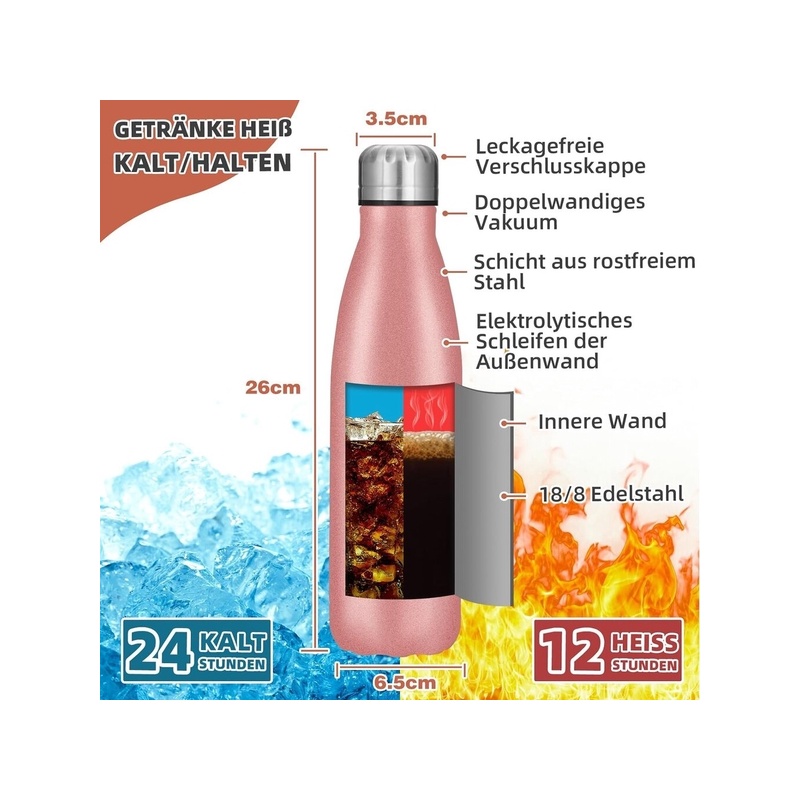 12 hours hot and cold for 24 hours: Double-walled vacuum insulation keeps drinks hot for up to 12 hours or cold for up to 24 hours. Perfect for ice water, hot coffee, tea, soup, sports drinks or just plain water. Avoid annoying plastic bottles and enjoy delicious hot drinks or fresh soft drinks anywhere.