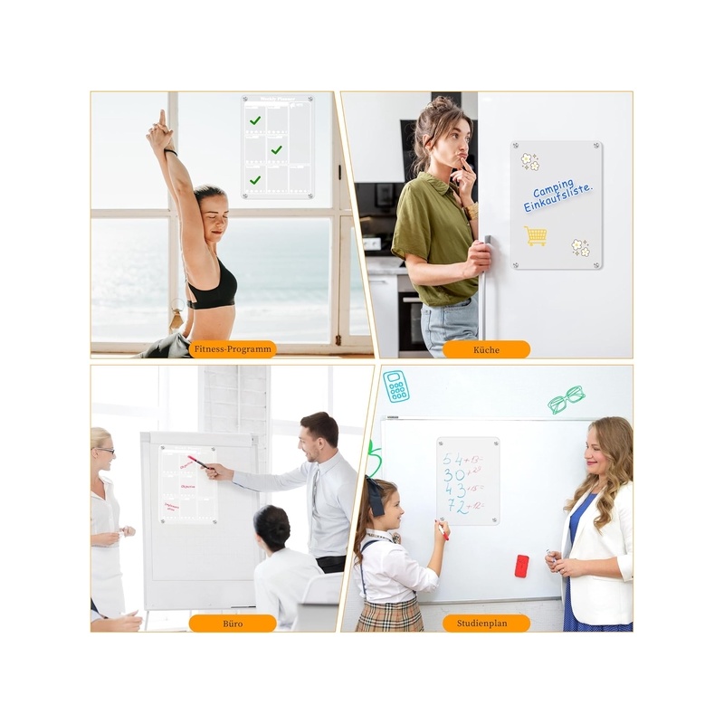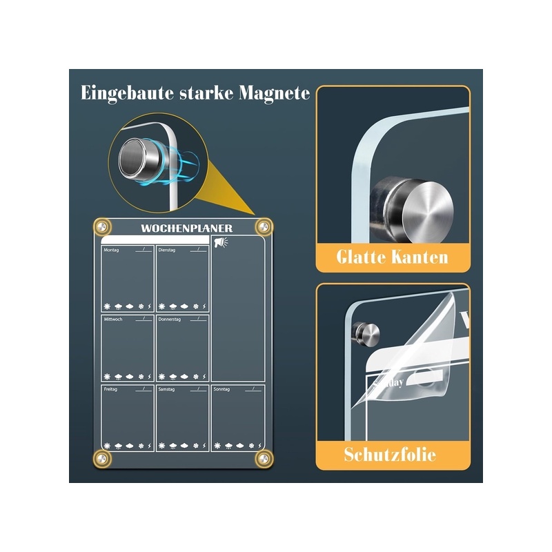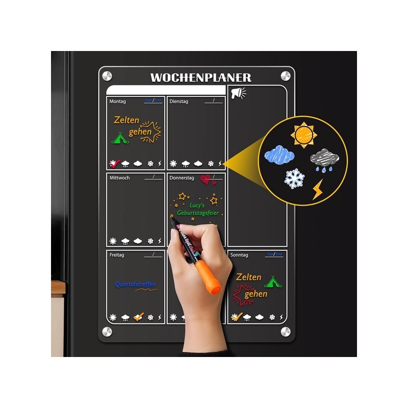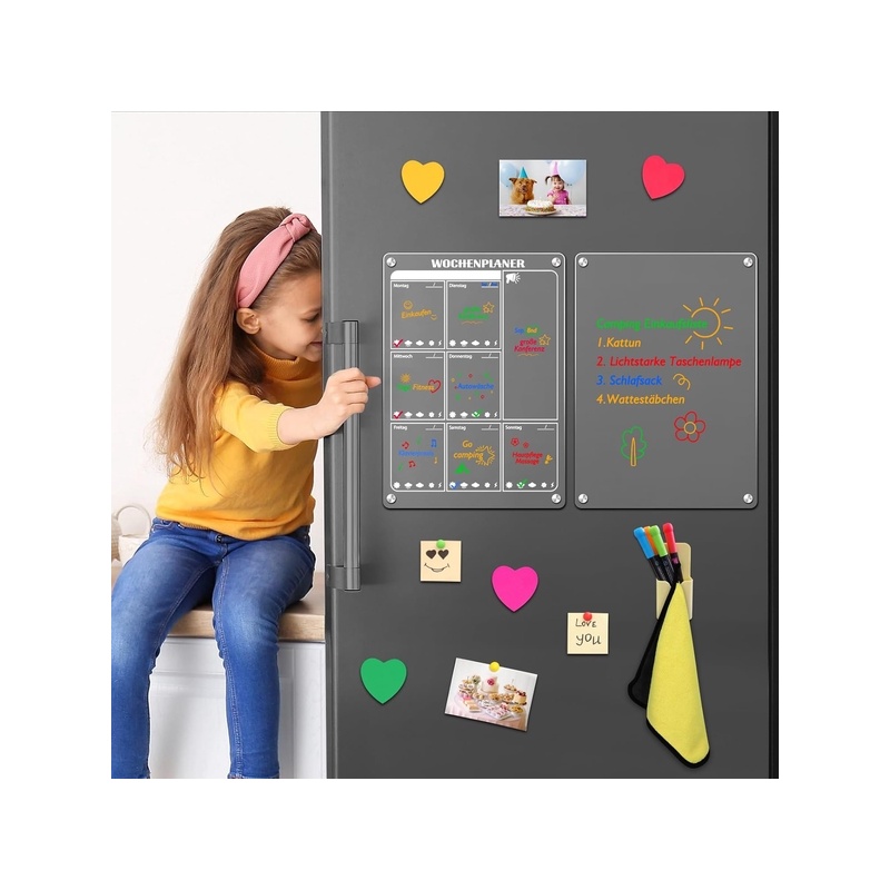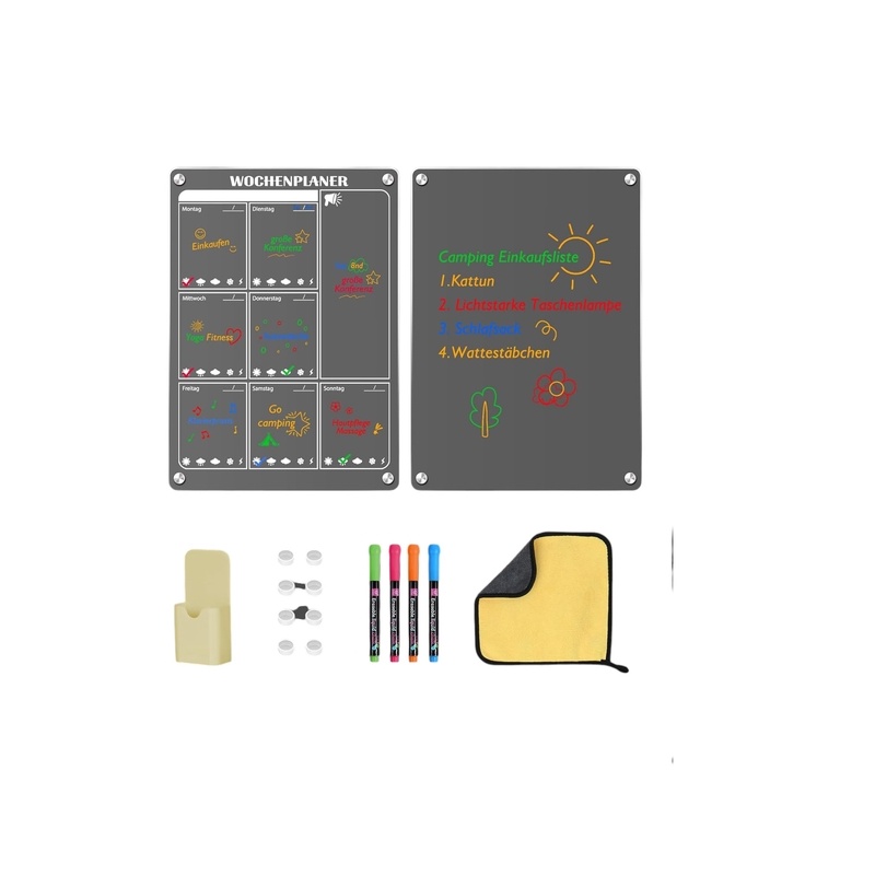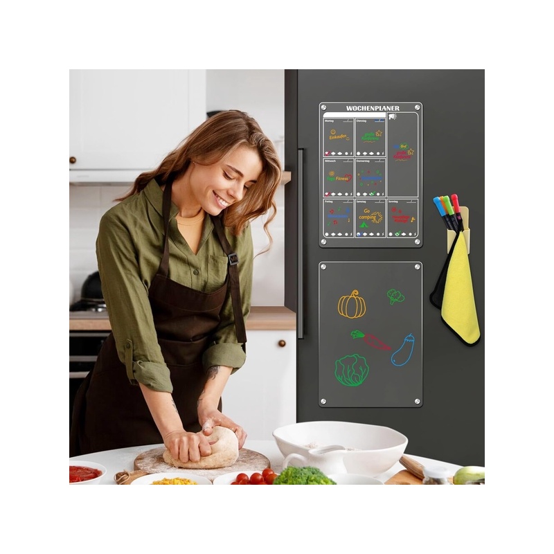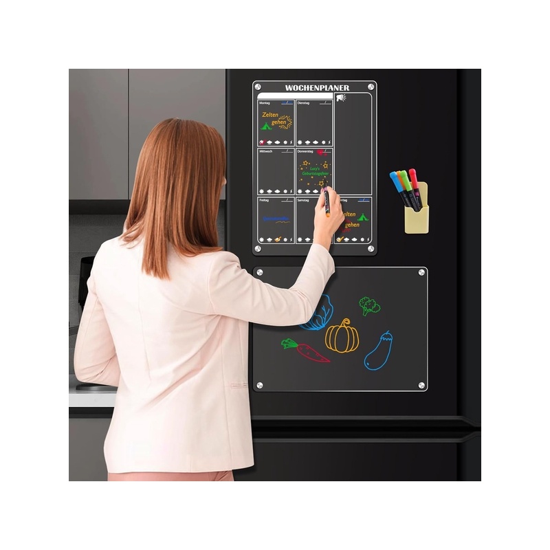 Weekly calendar for fridge, size 35 × 25 cm. The set includes a German-version acrylic weekly board, a blank acrylic board, 6 colored markers, a pen holder, a magnetic eraser board, a cleaning cloth, and 8 silicone pads.