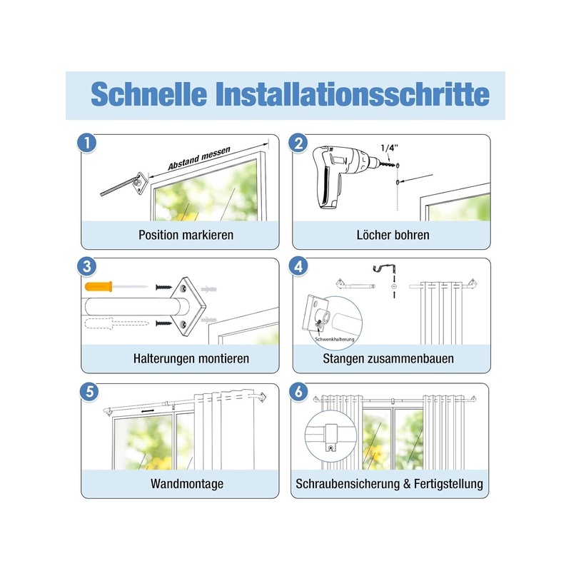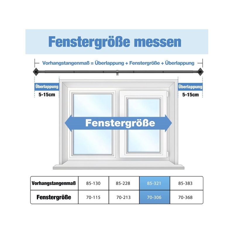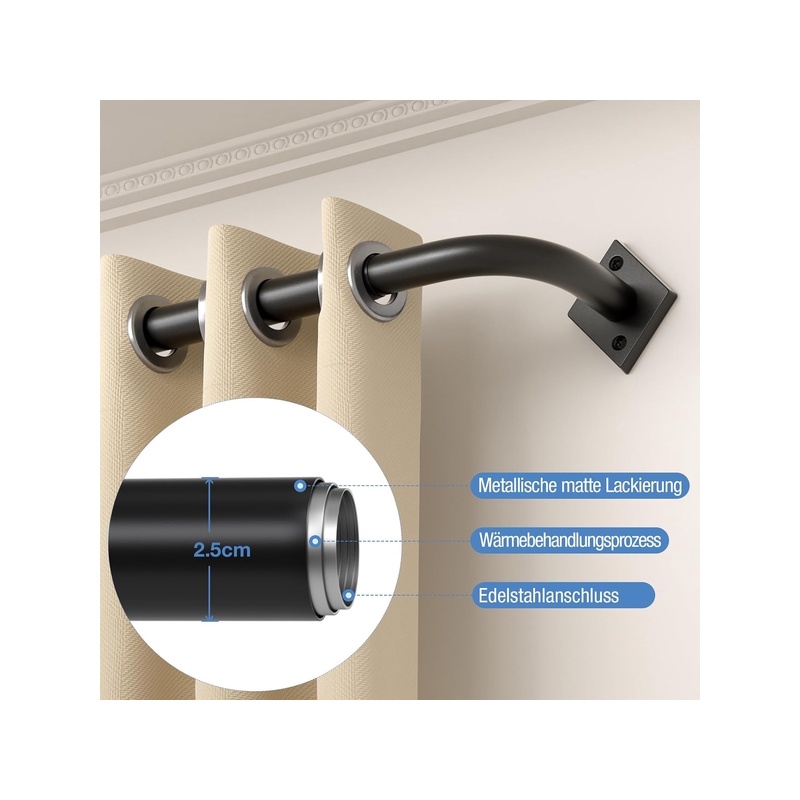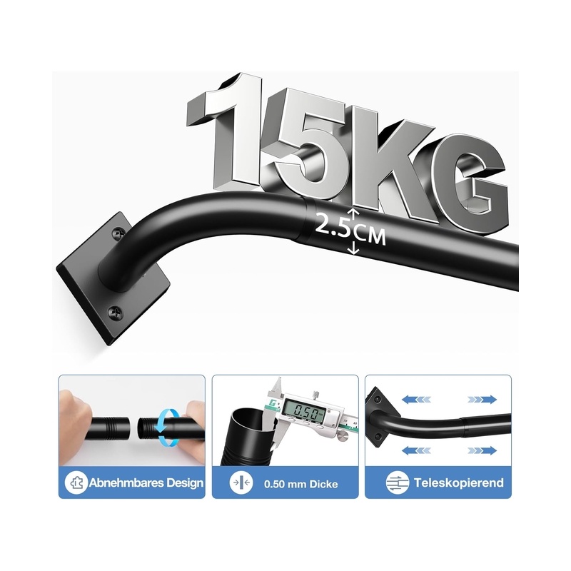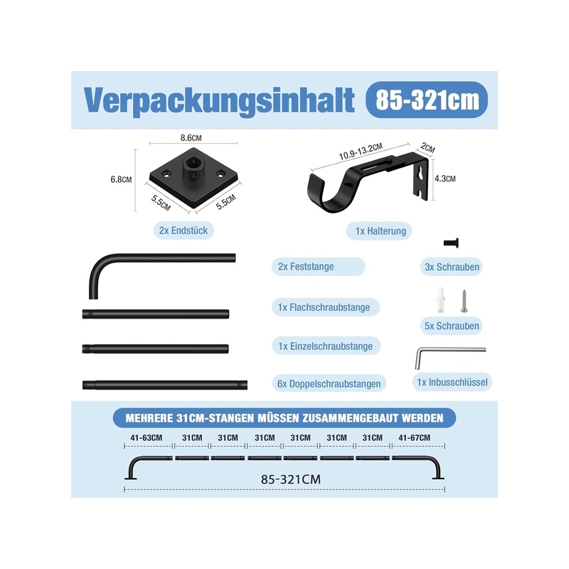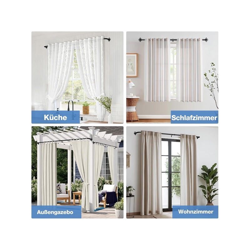 [Adjustable length and versatile use] The extendable curtain rod adjusts from 85 to 321 cm, ideal for living rooms, bedrooms, kitchens, and even outdoor use on terraces or gardens.