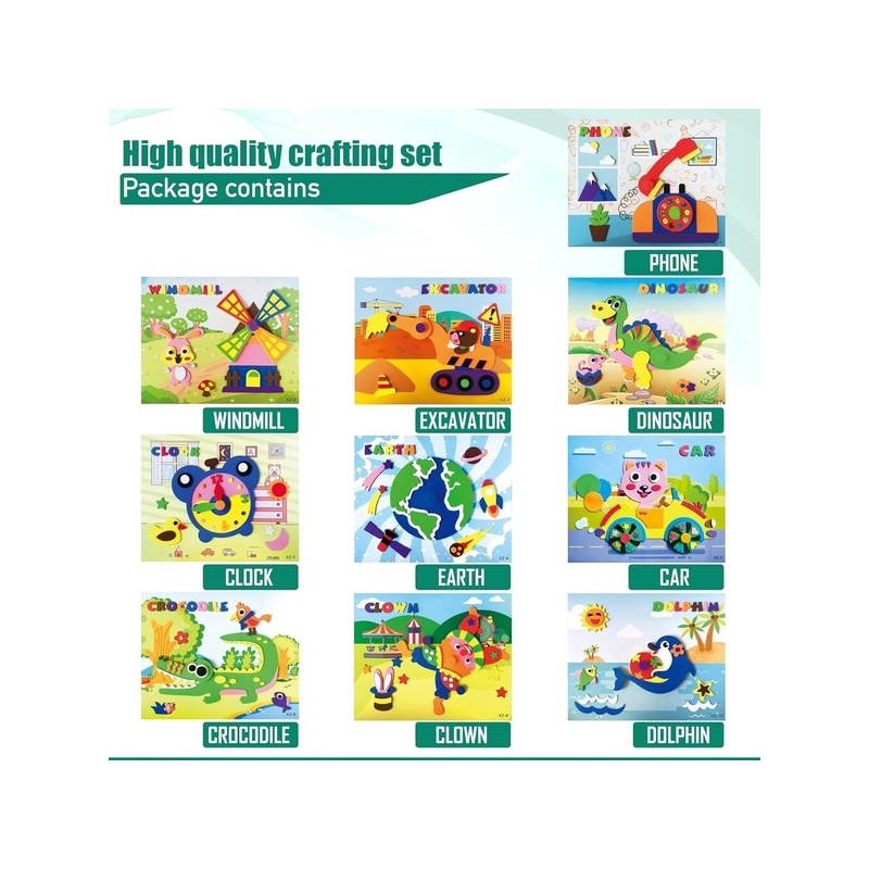 Mosaic Craft Kit – sisaldab kokku 10 mustrit (u 26,5 x 18,5 cm lehe kohta). DIY kleepuvate mosaiikide kunsti- ja käsitöökomplektide hulka kuuluvad: telefon, tuulik, ekskavaator, dinosaurus, kell, maa, auto, krokodill, delfiin ja kloun.