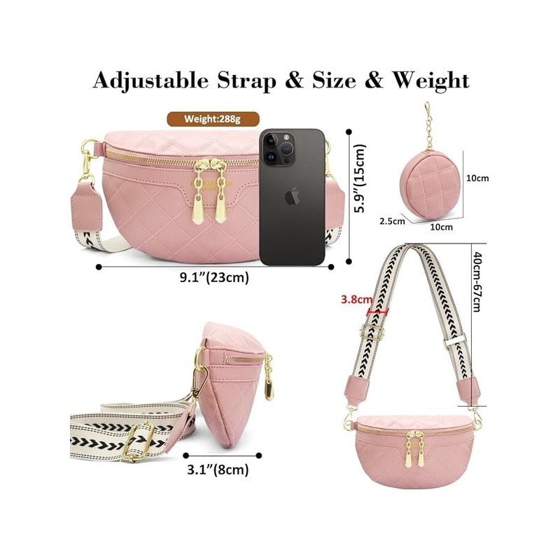 Ideaalne suurus: selle ilusa kerge väikese koti mõõtmed on 23 cm (9,1 tolli) x 5,9 tolli (15 cm) K x 3,1 tolli (8 cm) laius. Kaal: 288 g. Need on kaasaegsed kotid laia õlarihmaga, laius 3,8 cm (1,5). tolli), reguleeritav õlarihma pikkus: 40-67 cm (15,7-26,4 tolli).