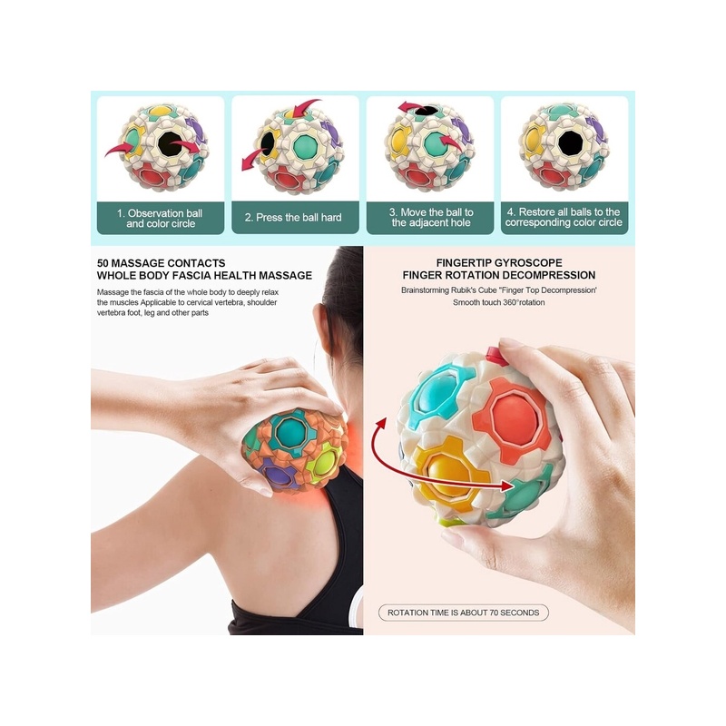 Rubiku kuubiku pallil on 12 auku ja 9 värvilist palli. Lapsed saavad segada üheksa palli värve ja liigutada neid sõrmedega läbi positsioneerimisavade. Pusle lõpuleviimiseks peavad nad kõik pallid sobitama sobivate värviliste rõngastega. Samuti saate kehtestada reeglid lastega ajaliselt piiratud värvide sobitamise mängudele, mis võivad arendada nende loogilist mõtlemist ja harjutada sensoorseid oskusi.