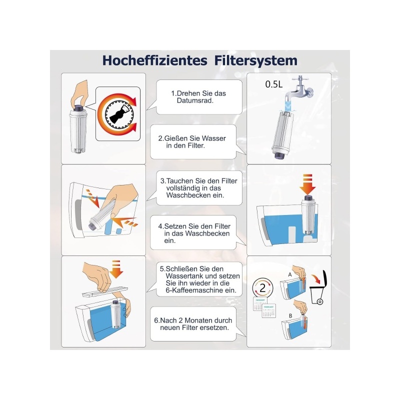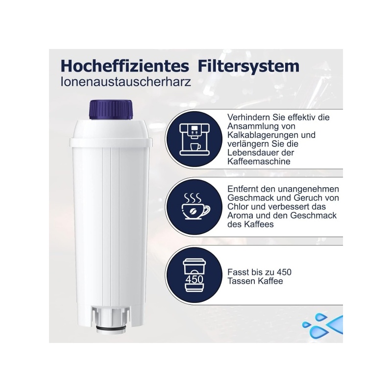 Parannettu vedenlaatu. Suodatin käyttää korkealaatuista ioninvaihtohartsia ja aktiivihiiltä, jotka poistavat tehokkaasti kalkkia, klooria ja raskasmetalleja. Tämä suojaa kahvikonetta, pidentää sen käyttöikää ja tuo runsaamman aromin jokaiseen kupilliseen.
