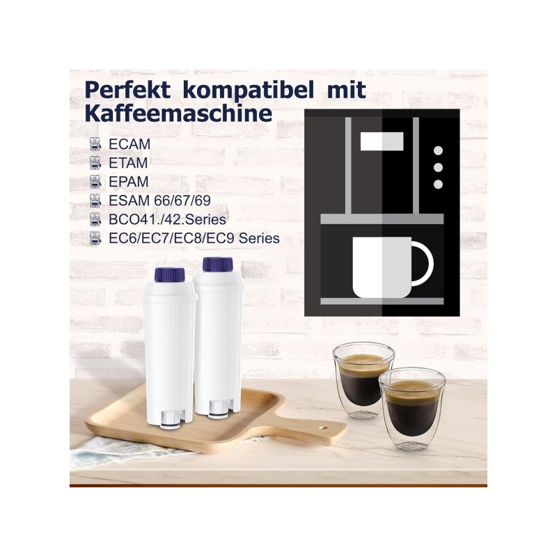 Yhteensopivat mallit: sopii De’Longhi ECAM-, ETAM-, EPAM-, ESAM-, BCO- ja EC-sarjoihin. Sopii myös suodattimiin De’Longhi DLS C002, Molifal FW600, Waterdrop WD-11-6, Aiitomg RB0001, Milux VAF006, iRhodesy RHS002, Fiitas FTS002, Wessper WES039, AQUA CREST AQ, Maxblue MB-C11 ja Golden Icepure CMF006.