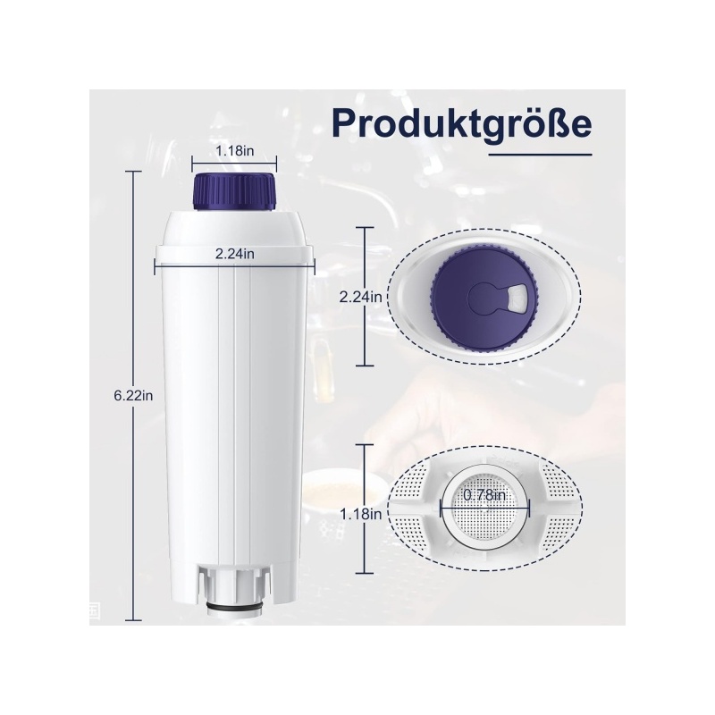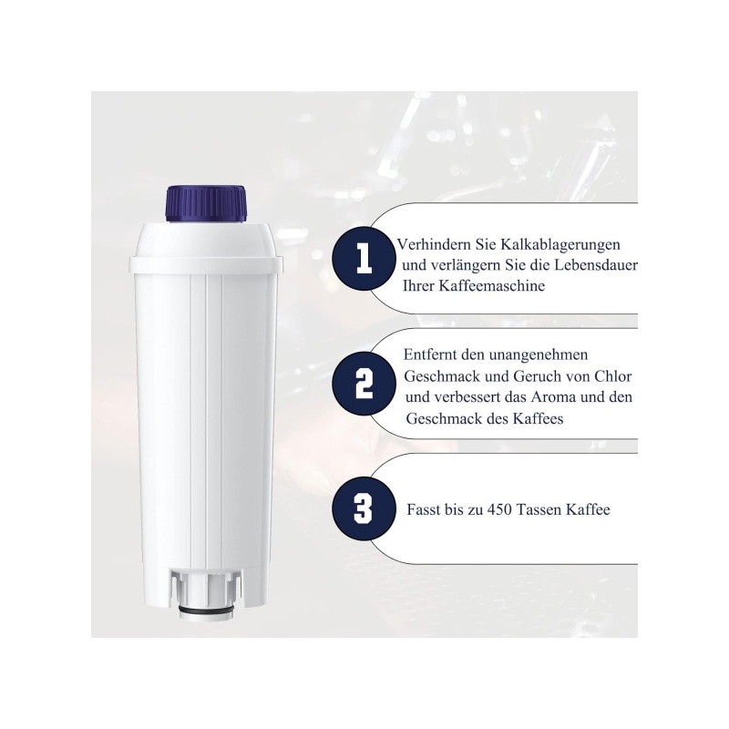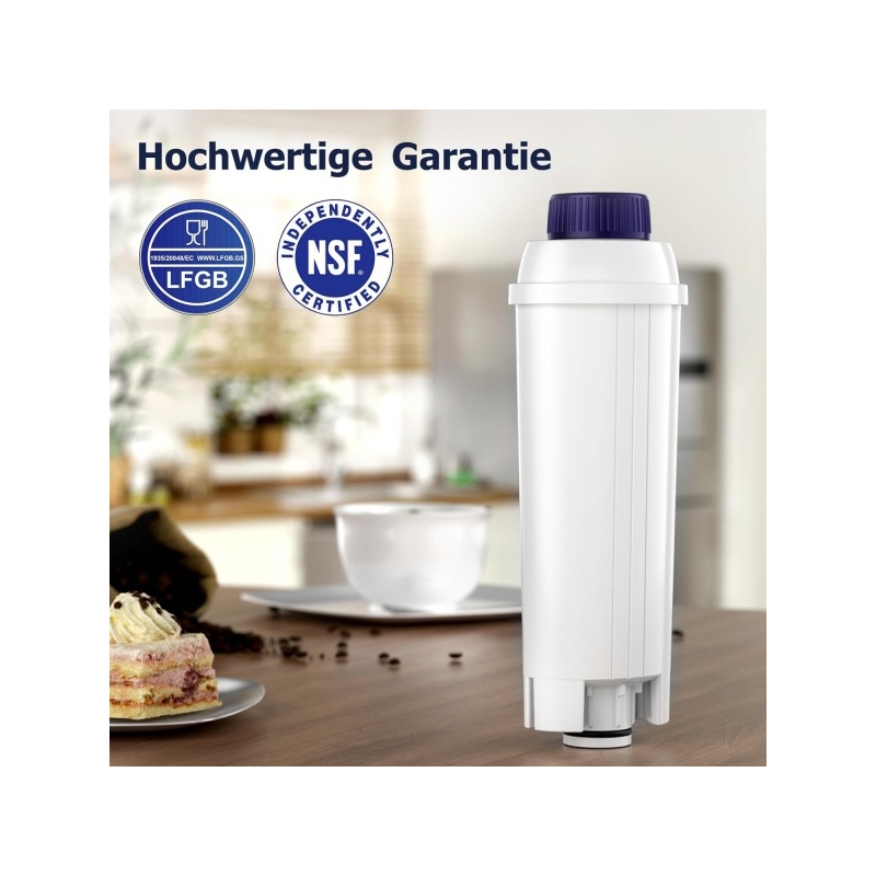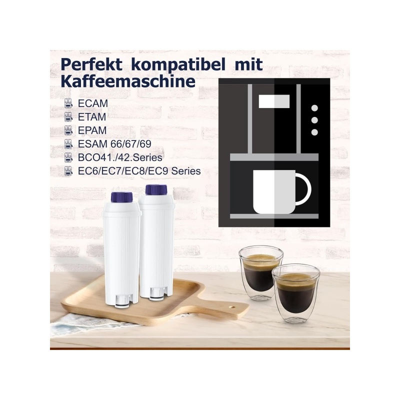 Yhteensopivat mallit: Tämä vedensuodatin sopii De'Longhi ECAM, ETAM, EPAM, ESAM, BCO ja EC -sarjan kahvikoneisiin. Patruuna sopii myös suodattimiin De'Longhi DLS C002, Molifal FW600, Waterdrop WD-11-6, Aiitomg RB0001, Milux VAF006, iRhodesy RHS002, Fiitas FTS002, Wessper WES039, AQUA CREST AQ, Maxblue MB-C11 ja Golden Icepure CMF006.