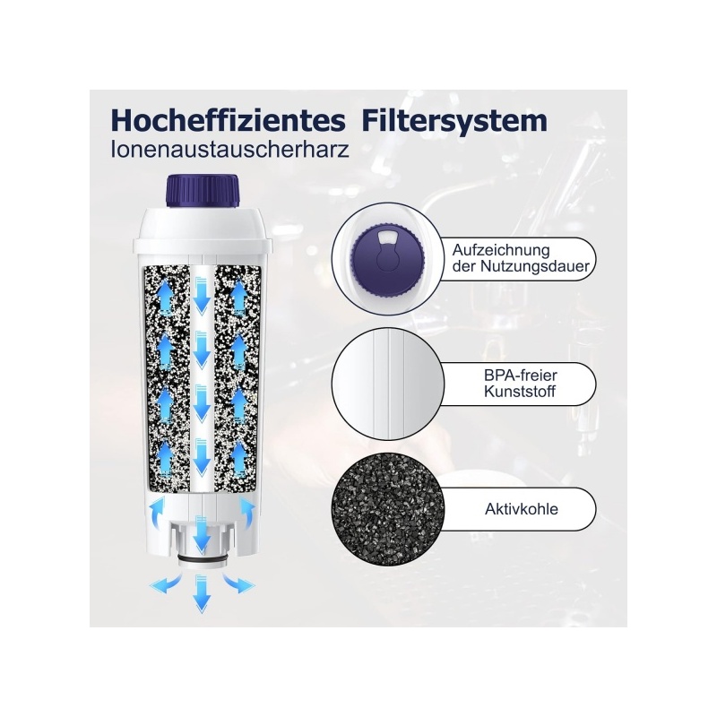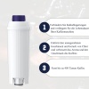Parannettu vedenlaatu. DeLonghi-suodattimemme käyttää korkealaatuista ioninvaihtohartsia ja aktiivihiiltä, jotka poistavat tehokkaasti kalkkia, klooria ja raskasmetalleja. Tämä suojaa kahvikonettasi, pidentää sen käyttöikää ja takaa täyteläisemmän aromin jokaisessa kupillisessa.
