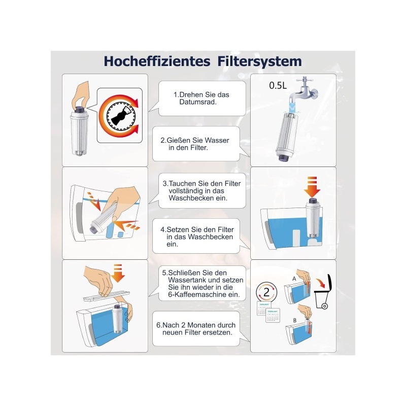 Säännöllinen vaihto: Parhaan veden suodatuksen saavuttamiseksi suodatin on suositeltavaa vaihtaa 2 kuukauden välein veden laadusta riippuen. Ennen käyttöä aseta suodatin puhtaaseen veteen ja anna sen olla, kunnes kuplat katoavat.