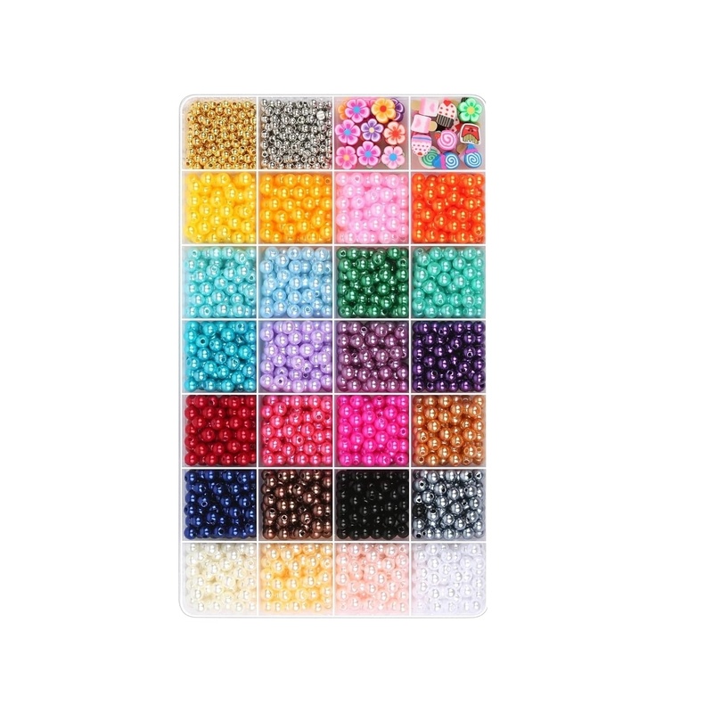 Muovinen laatikko erillisillä osastoilla: jokaisella helmityypillä on oma osastonsa korkeilla reunoilla, jotta ne pysyvät järjestyksessä.