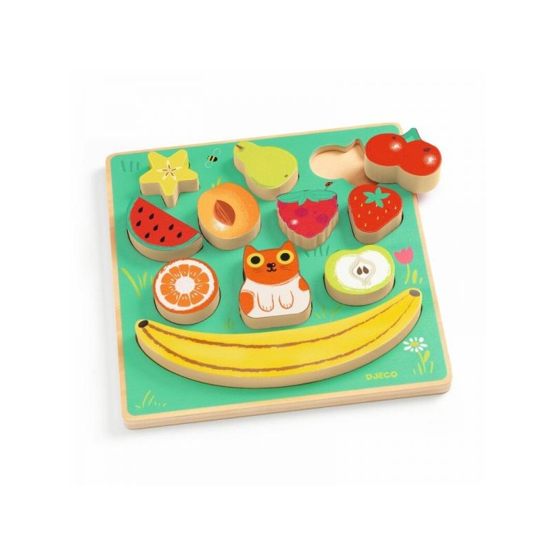 Kaks ühes – puidust pusle ja tasakaalumäng. 3D-puuvili ja kass seisavad ise püsti ning neid saab teineteise peal tasakaalustada, moodustades banaanist alusel püramiidi. Komplekti kuulub puidust alus (21 x 21 x 2.5 cm) ja 11 puidust kujukest. Toetab kujundite ja värvide tundmaõppimist ja peenmotoorika arengut. Tükid lihtsad haarata. Sobilik alates 18. elukuust.