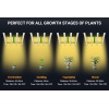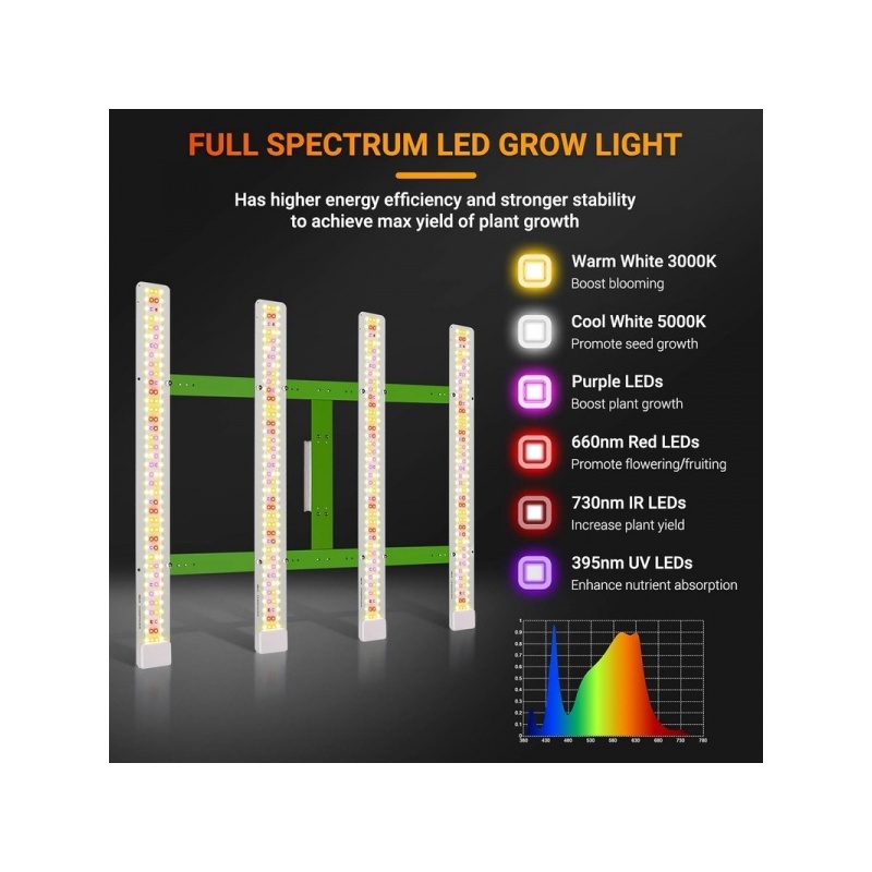 【Täysi spektri, korkea PPFD】: DragonLight MW4000 LED-fytolamppu tarjoaa täyden luonnollisen auringonvalon spektrin ja sopii erinomaisesti parantamaan kasvien kasvuolosuhteita. Varustettu LED-valoilla: lämmin valkoinen (3000K), kylmä valkoinen (5000K), violetti (5000K), UV (395 nm), punainen (660 nm) ja IR (730 nm). PPFD-arvo on jopa 1251, mikä takaa tehokkaan valaistuksen kaikissa kasvuvaiheissa: taimista kukintaan ja hedelmien muodostumiseen.