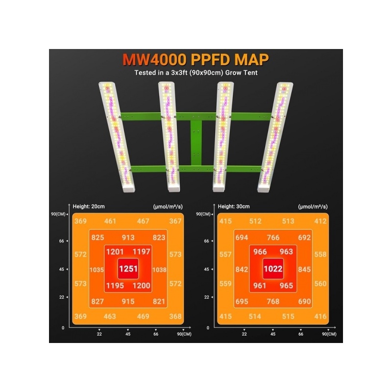 【Laaja kattavuus ja energiansäästö】: MW4000 LED-kasvilamppu neljällä palkilla, koko 67,8 × 56,7 cm, valaisee jopa 120 × 120 cm alueen. Helppo asentaa kattoon, sopii erinomaisesti telttoihin, kasvihuoneisiin, taimille, hydroponisiin järjestelmiin ja muihin tiloihin. Kuluttaa vain 200 W, korvaa 1000 W HPS/MH-lamput, säästää jopa 80 % energiaa ja tarjoaa maksimaalisen tehokkuuden.