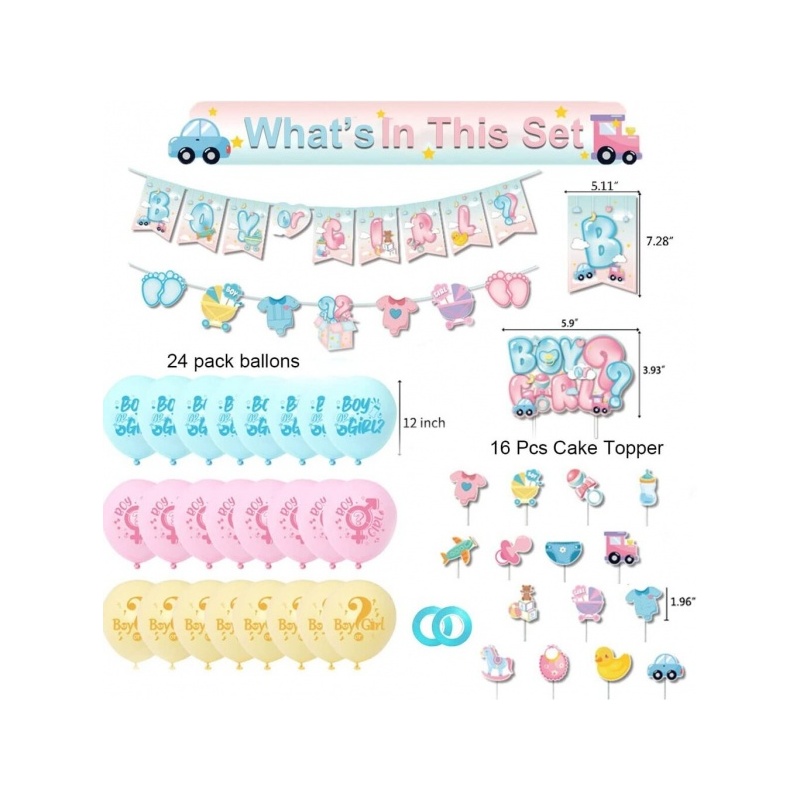 - Laadukas sisustus pojalle tai tytölle: gender-juhlapallot koostuvat 24 lateksiilmapallosta kolmessa värissä (sininen, pinkki, keltainen) 30,5cm / 2,8g Juhlakortti koostuu 300g valkoisesta paperikortista, täysväristä ja kirkkaasta väristä, kuten sekä sukupuolijuhla-aiheisia kakkulisäosia, jotka voivat luoda paremmin tunnelman.