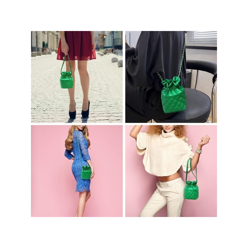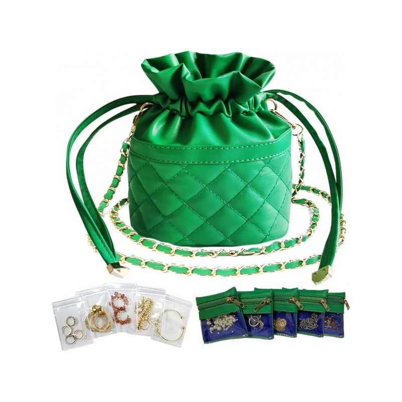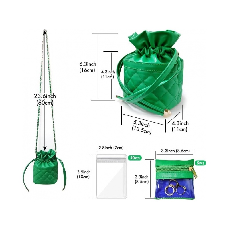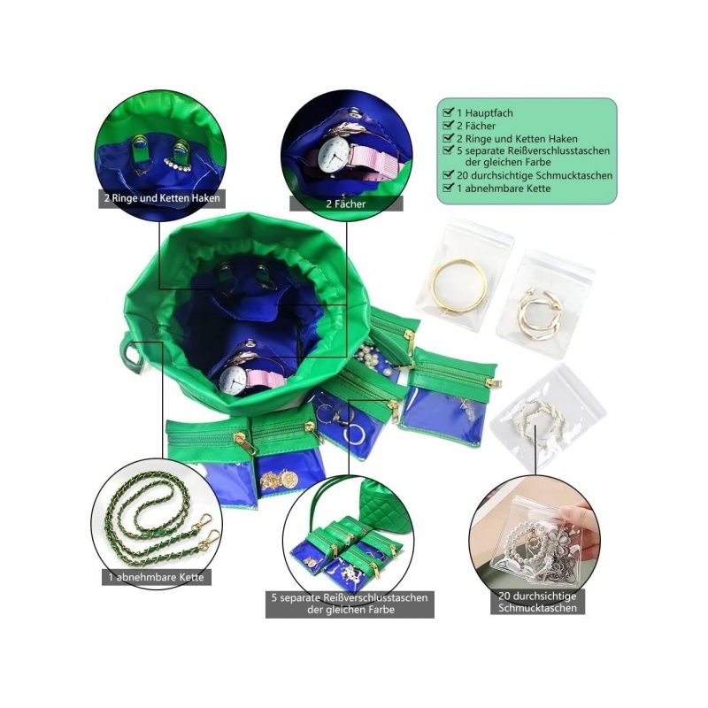 Koko: Olkalaukku ketjulla: 19 x 10 x 19,2 cm, koko 5 sisempi korutasku: 8,6 cm x 8,6 cm, läpinäkyvä vetoketjullinen korulaukku: 7 cm/10 cm Paino: n. 300 g