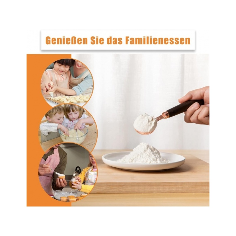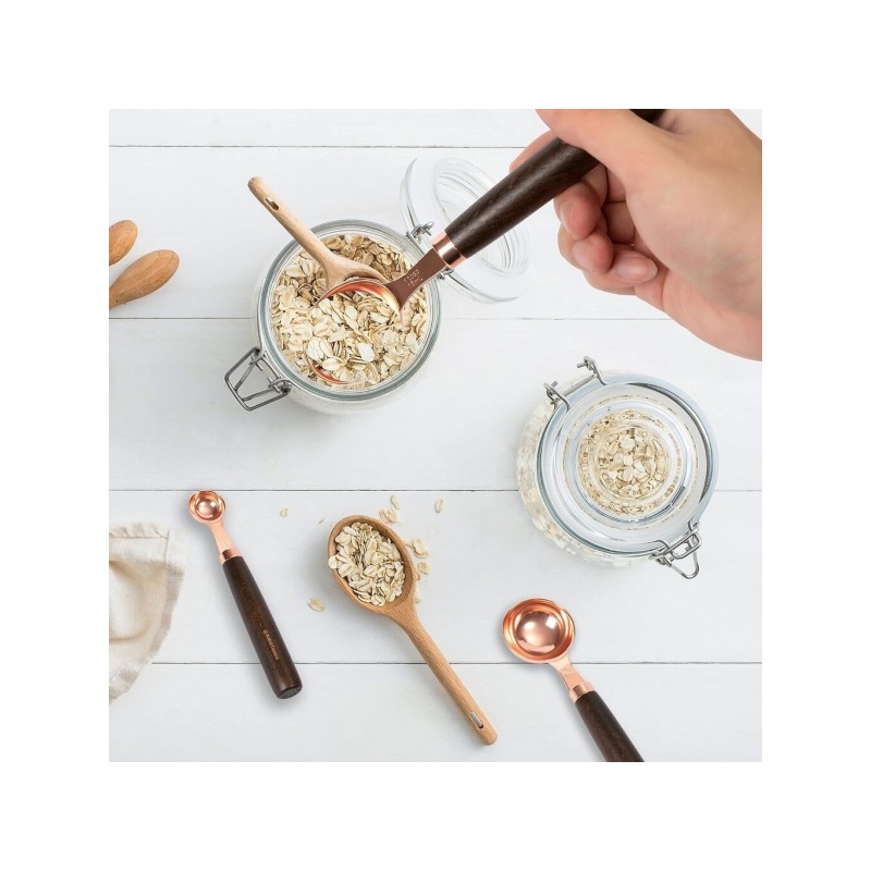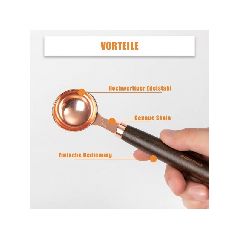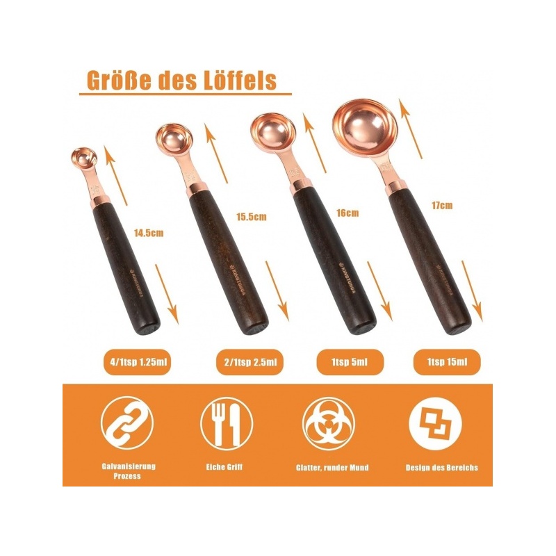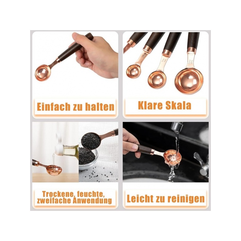 Ensiluokkainen laatu: Mittalusikkasarjamme on valmistettu korkealaatuisesta ruostumattomasta teräksestä. Kullattu, puinen kahva.