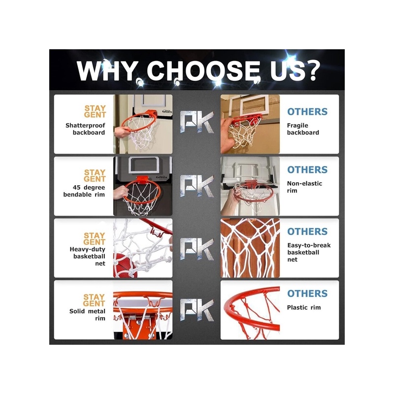 Lahja koripallopelille aikuisille ja lapsille: olipa kyseessä koripallo makuuhuoneessa tai toimistokoripallo, minisettimme kotiin on paras valintasi syntymäpäivälahjaksi tai juhlaan. Se voi antaa aikuisille mahdollisuuden nauttia rentouttavista hetkistä työssä ja tuottaa iloa lapsille.