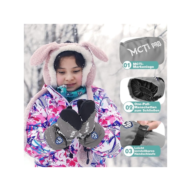Varmistaakseen täydellisen istuvuuden lapsesi pienille käsille, MCTi Kids -käsineet käyttävät joustavia siteitä hihansuissa ja säädettävää tarrakiinnitystä ranteissa. Laajennetun hihan muotoilun ansiosta hansikas sopii täydellisesti takin hihaosan päälle, pitää lapsen lämpimänä ja estää lumen ja kylmän ilman pääsyn käsineen sisään.