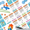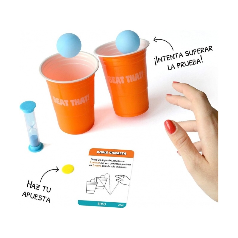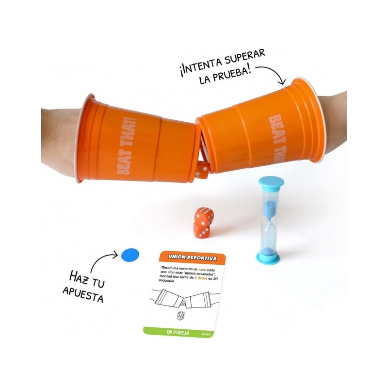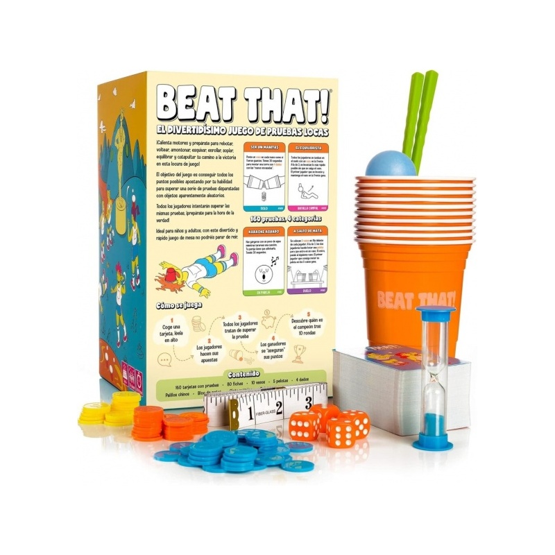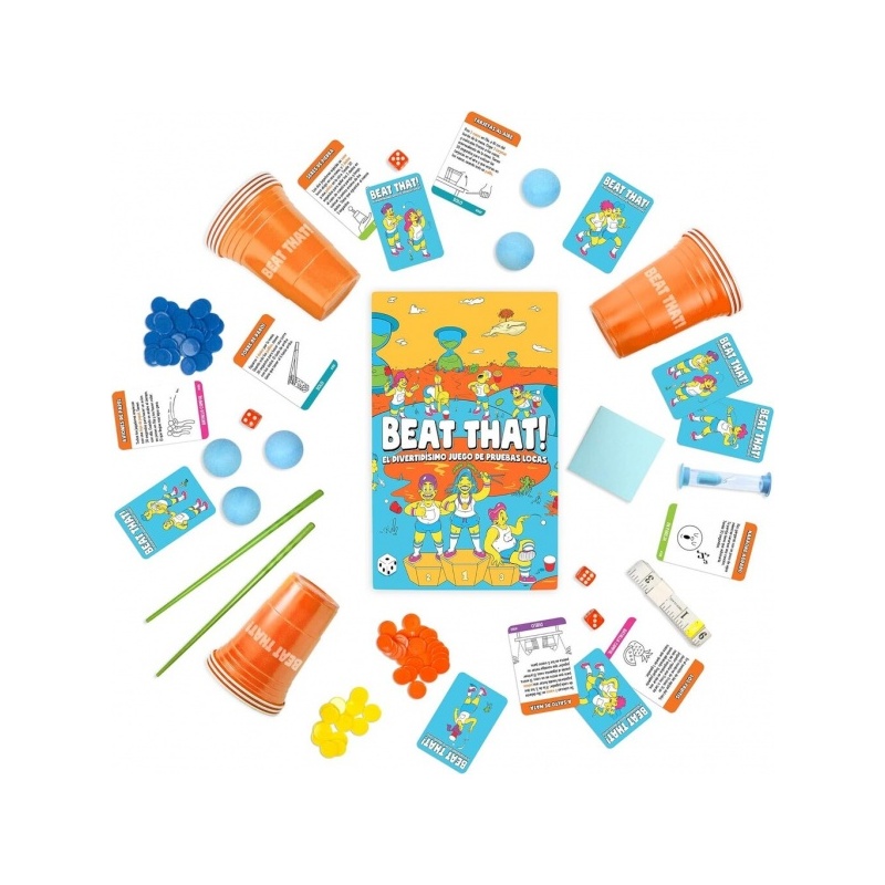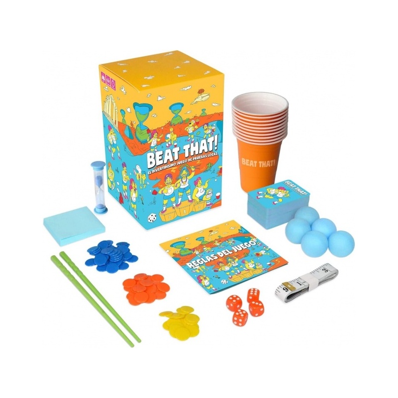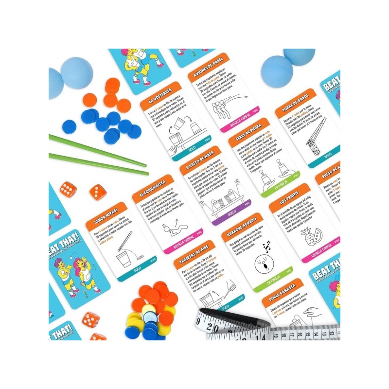 160 tehtäväkorttia, 80 vedonlyöntirahaa, 10 kuppia, 5 palloa, 4 noppaa, mailat, repäisylevyt, mittanauha, tiimalasi, ohjeet