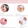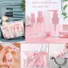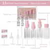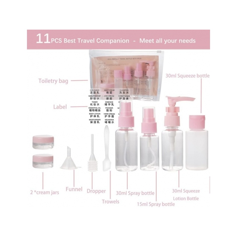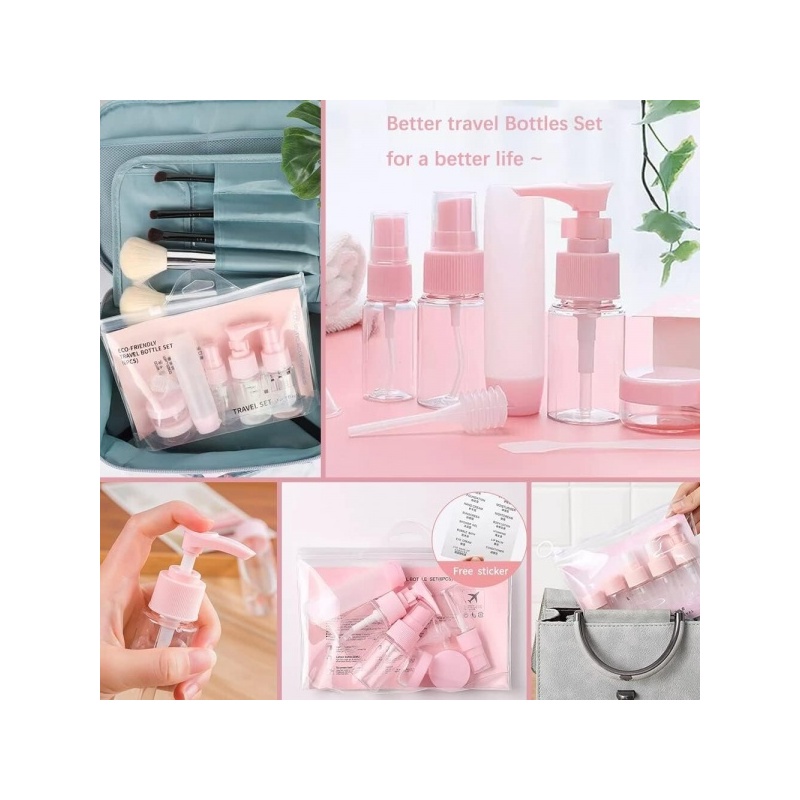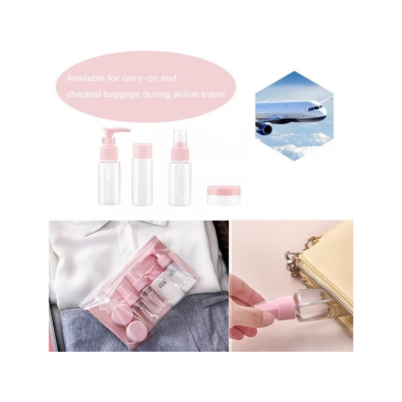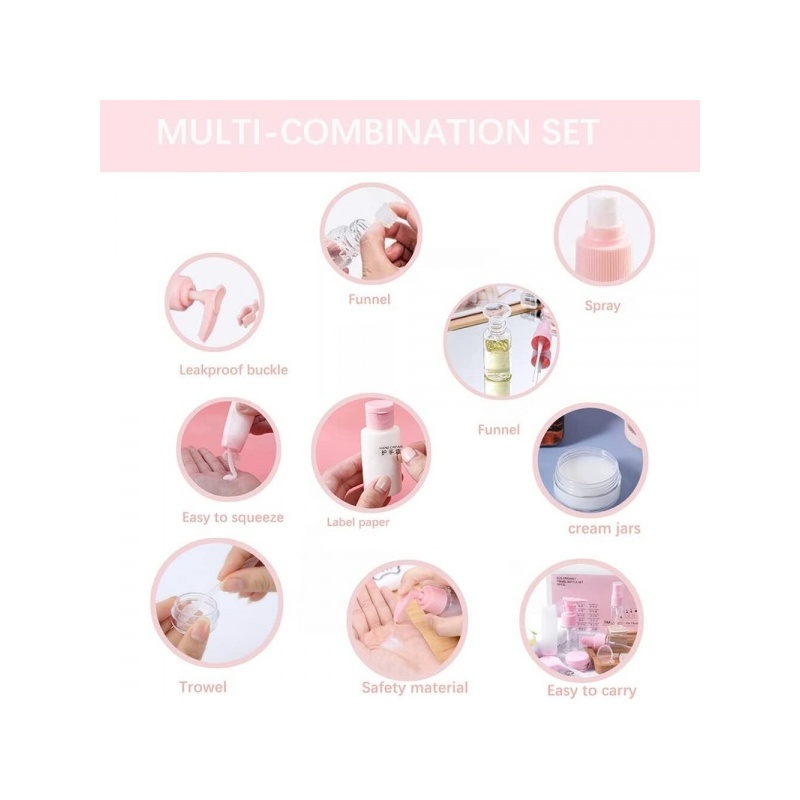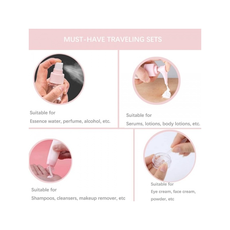 Vuototiivis muotoilu: Matkakonttien avulla voit vihdoin sanoa hyvästit vaatekaappisi ja matkatavaroiden vuotaville nesteille! Jokainen pumppupullo on tiivis, ja mukana tuleva pussi tarjoaa kaksinkertaisen suojan, mikä varmistaa, että henkilökohtaiset esineesi ovat suojassa vuodoilta, roiskeilta tai tippumiselta äkillisten ilmanpaineen ja lämpötilan muutosten aikana.