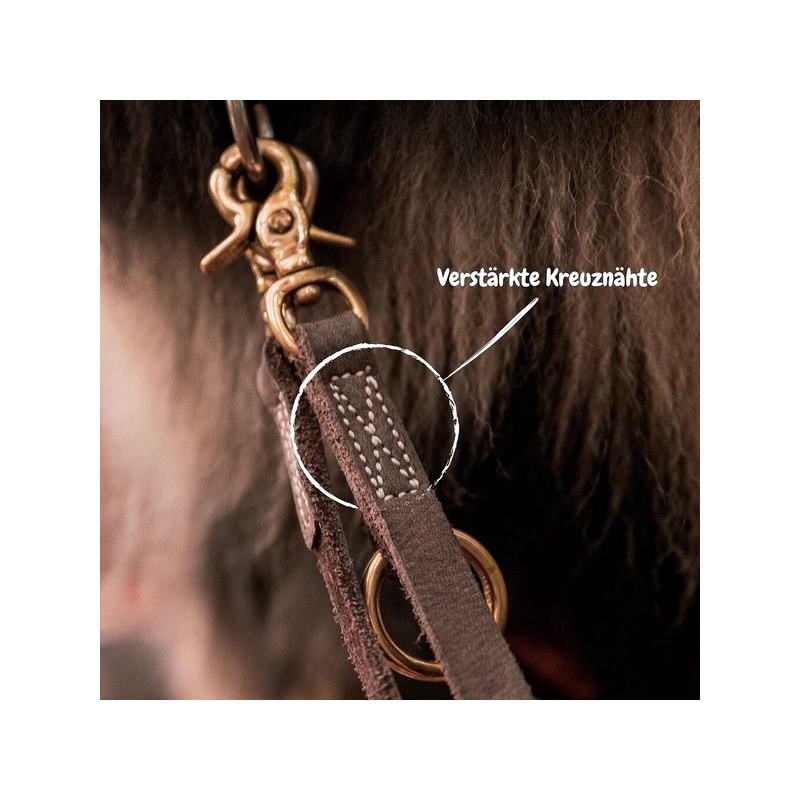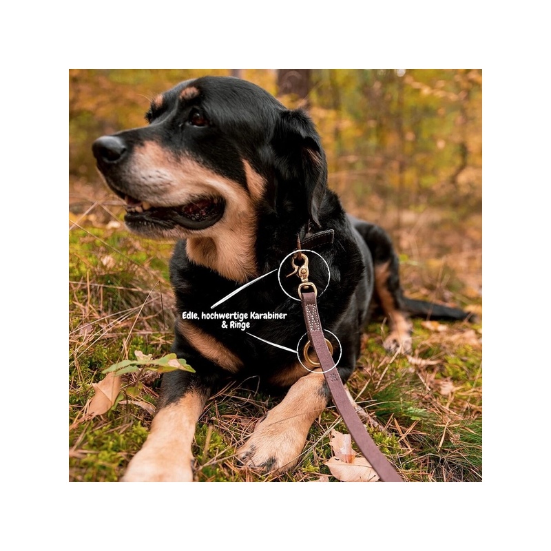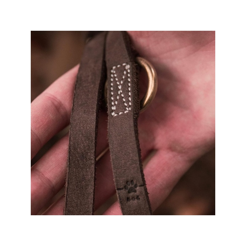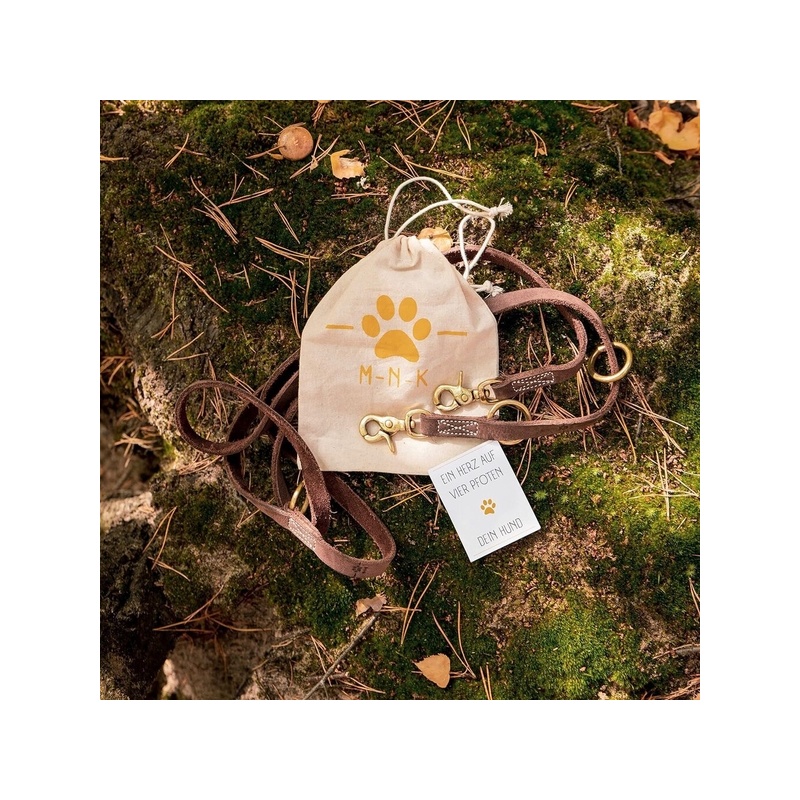 M-N-K koiran talutushihna on valmistettu hienosta puhvelin nahasta. Sen pehmeä iho tuntuu hyvältä käsissäsi. Kultasävyiset messinkikarabiinit tarjoavat hienostuneen ja tyylikkään ilmeen