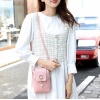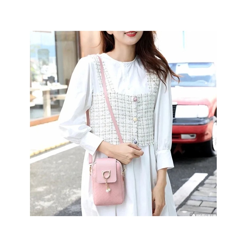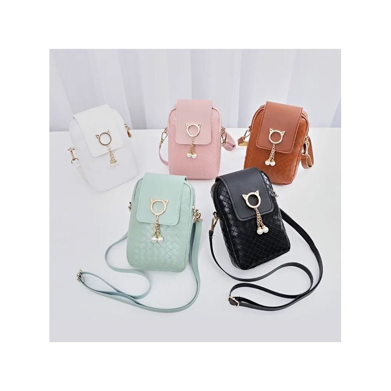 Mini crossbody-matkapuhelinlaukku, jossa kudotut helmet ja tupsut.