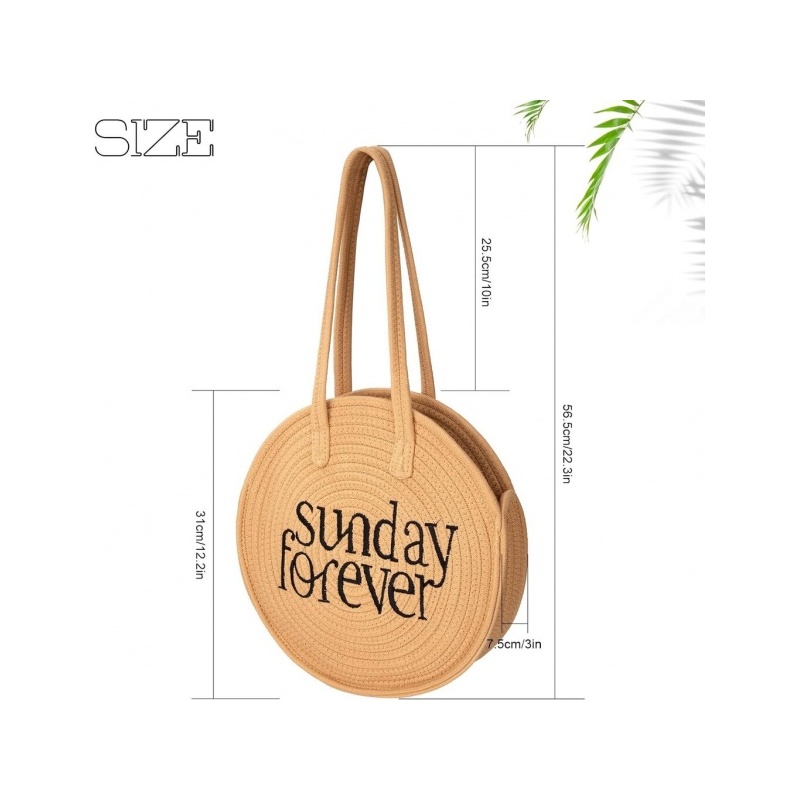 Mitat: 31 cm x 31 cm x 7,5 cm / 12,2 x 12,2 x 3 tuumaa. Olkahihnan korkeus pystysuunnassa, n. pituus: 25,5cm/10 tuumaa, elegantti pallon muotoinen, helppo sovittaa kesätyyliisi.
