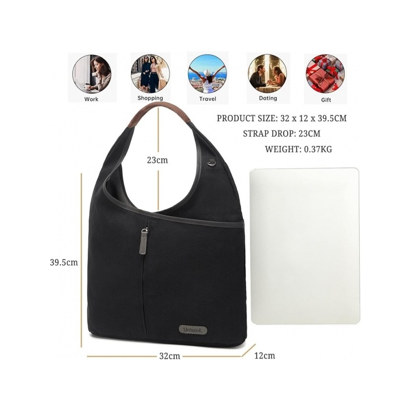 Suuri kapasiteetti ja käytännöllisyys: 39,5 x 12 x 32 cm, paino: 0,37 kg, olkahihnan pituus: 23 cm Laukku on suuri ja sopii sateenvarjolle, kosmetiikalle, A4-kansiolle ja kirjoille sekä tarvikkeille.