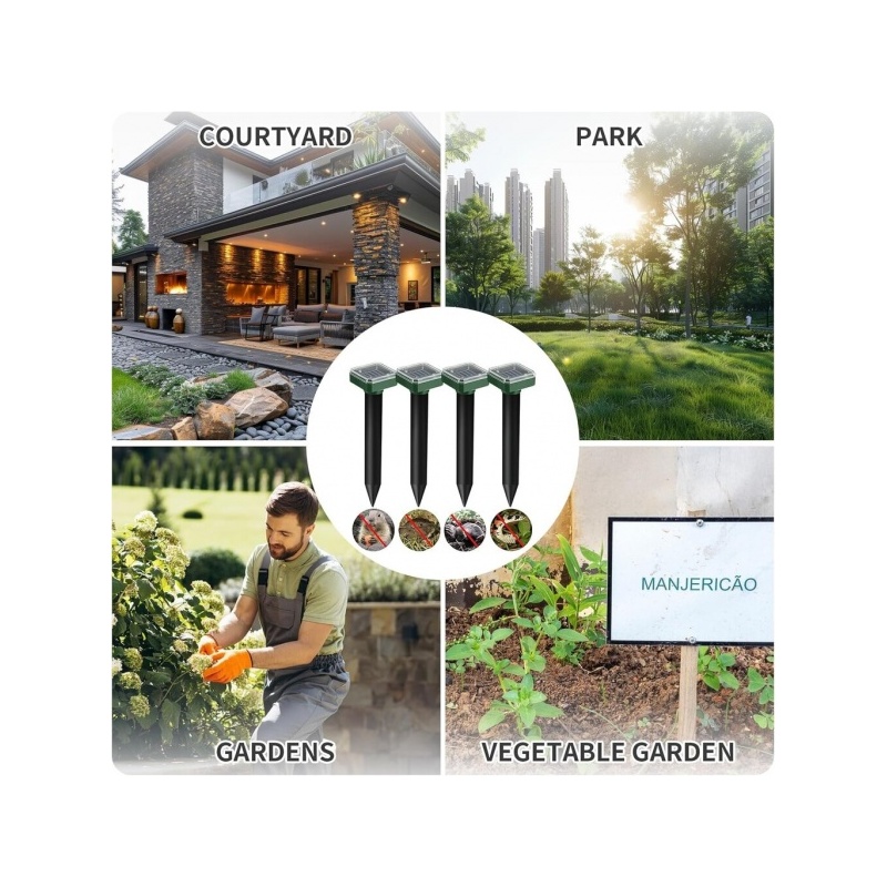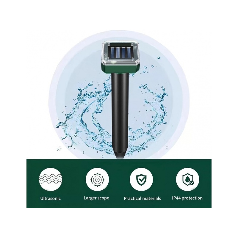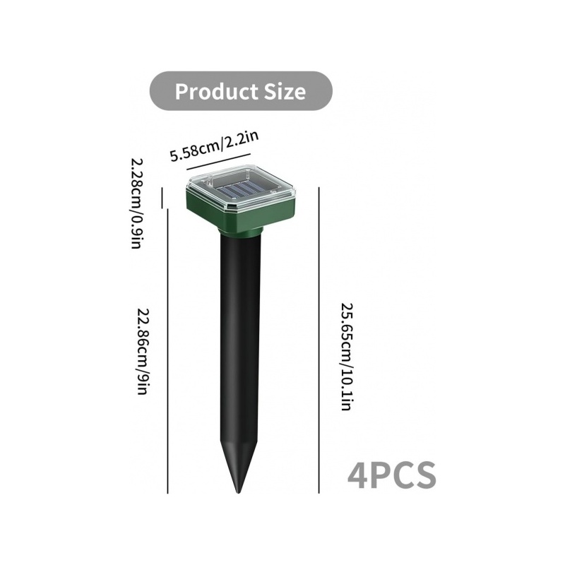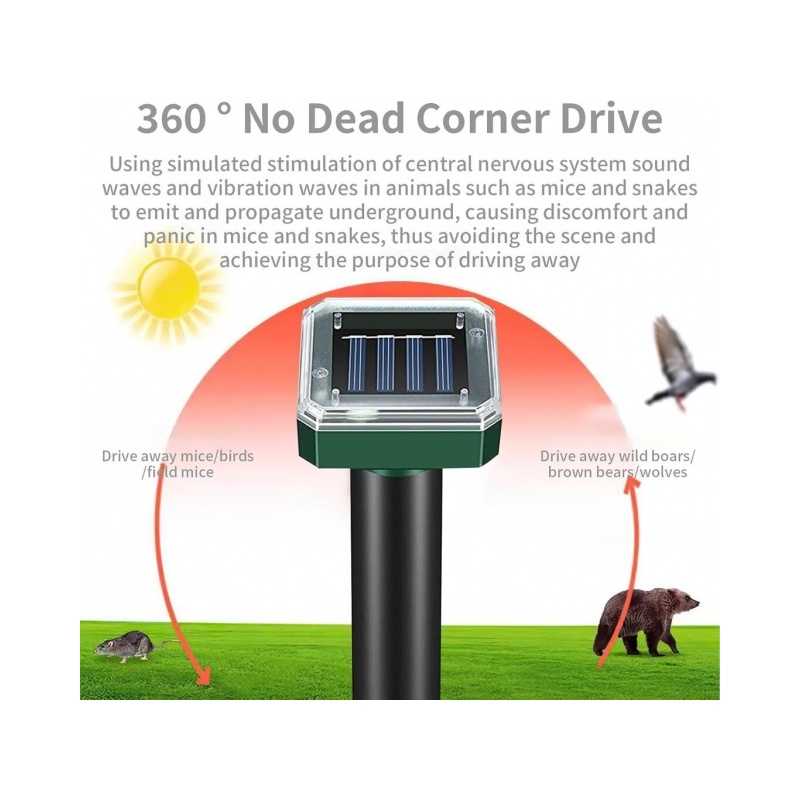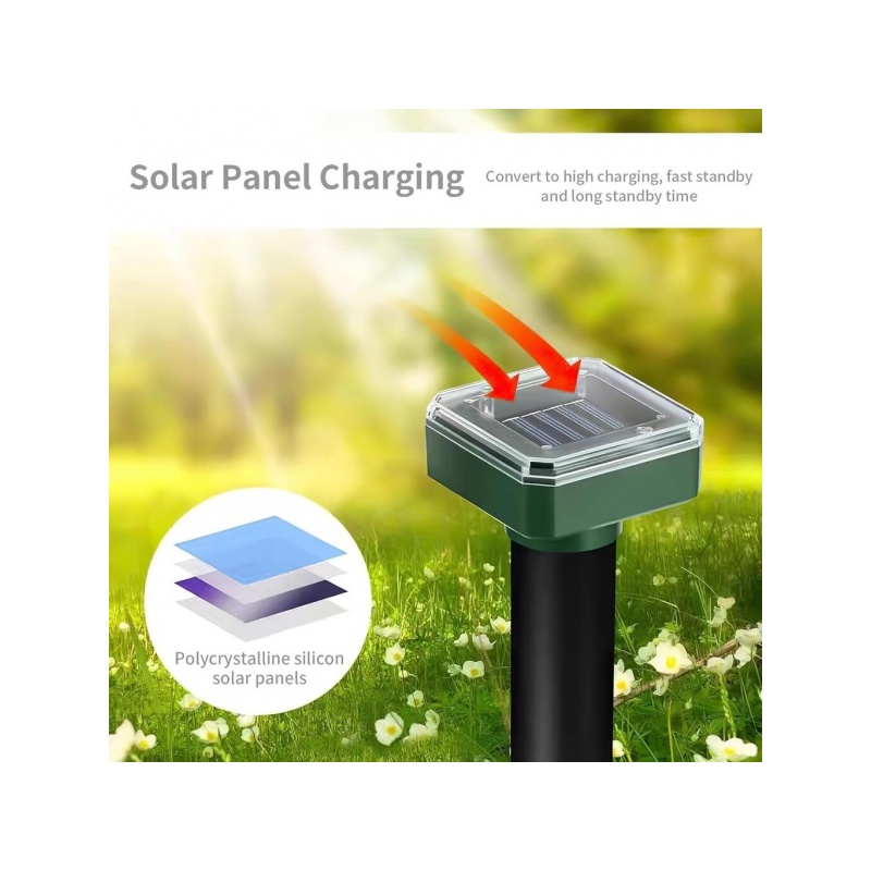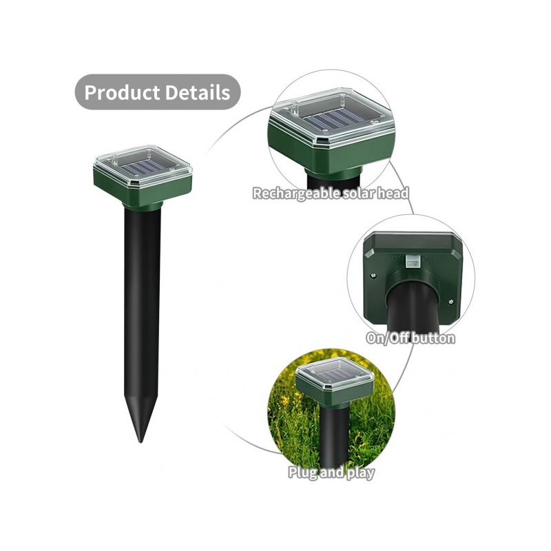 【HELPPOKÄYTTÖINEN ULKOKÄYTTÖÖN KÄYTETTÄVÄ TUHOLAISTORJUNTARATKAISU】 Asenna se vain puutarhaasi, nurmikollesi tai pihallesi luodaksesi tuholaisvapaan alueen. Tämä kätevä ratkaisu on kemikaaliton ja auttaa ylläpitämään terveellistä ympäristöä perheellesi ja lemmikeillesi. 【AURINKOENERGIALLA TOIMIVA TEHOKKUUS】 Tämä aurinkoenergialla toimiva myyränhävittäjä on ympäristöystävällinen ja kustannustehokas, ja se latautuu helposti auringonvalolla jatkuvaan käyttöön ilman paristoja.