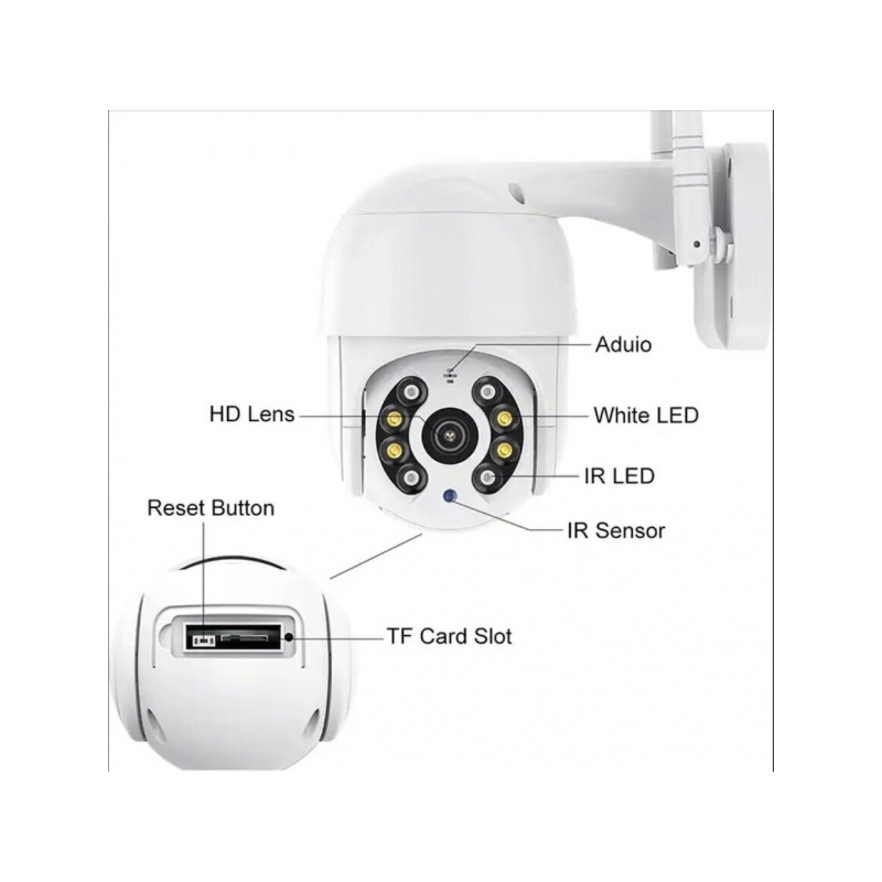 Toiminnot: Kaksisuuntainen ääni, PTZ/TILT, hälytys I/O, RESET, sisäänrakennettu mikrofoni, vedenpitävä/säänkestävä, laajakulma, sisäänrakennettu sireeni.