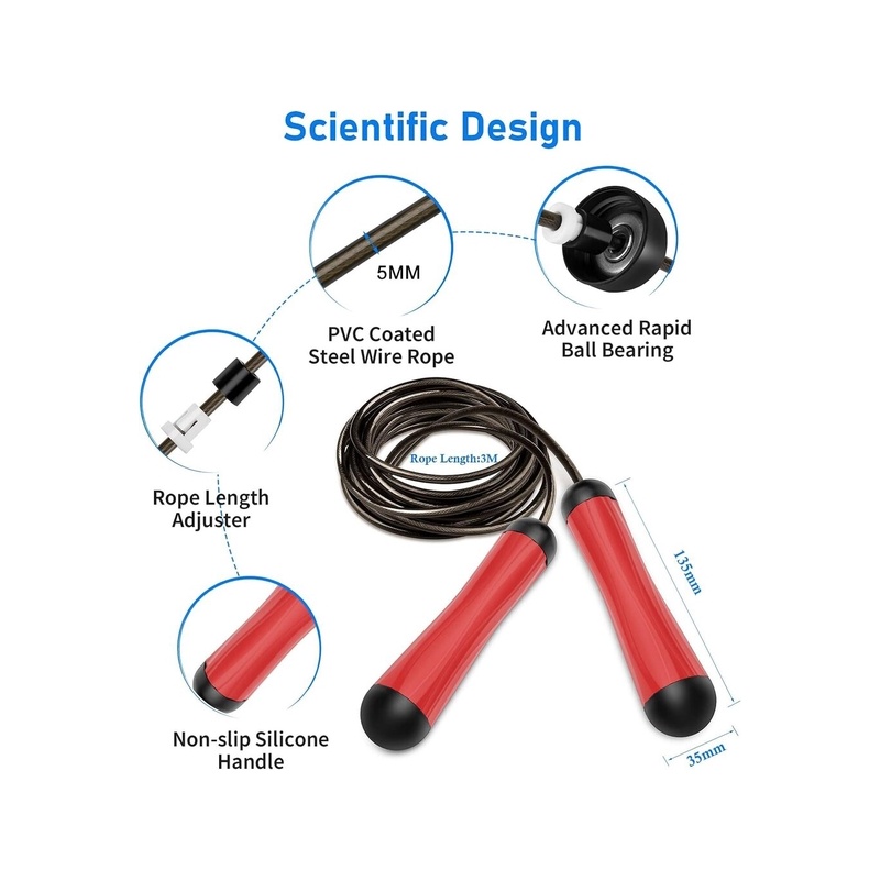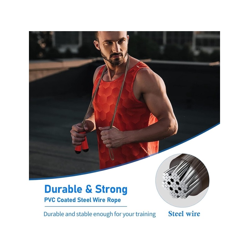PVC-pinnoitettu teräshyppyköysi: Hyppynaru on valmistettu PVC-päällystetystä teräsköydestä, jonka halkaisija on 5 mm ja paksusta teräsköydestä, mikä tekee hyppynarusta mukavamman koskettaa. Kestävä PVC-materiaali takaa pitkän käyttöiän.