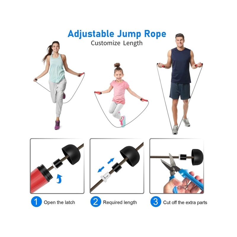 Laadukas, kestävä PVC-hyppyköysi on 7 mm paksu ja siksi raskaampi kuin markkinoilla olevat tavalliset 3,5 mm:n hyppynarut. Aloita yksinkertaisesti irrottamalla kahvojen yläosa säätääksesi haluttua pituutta.