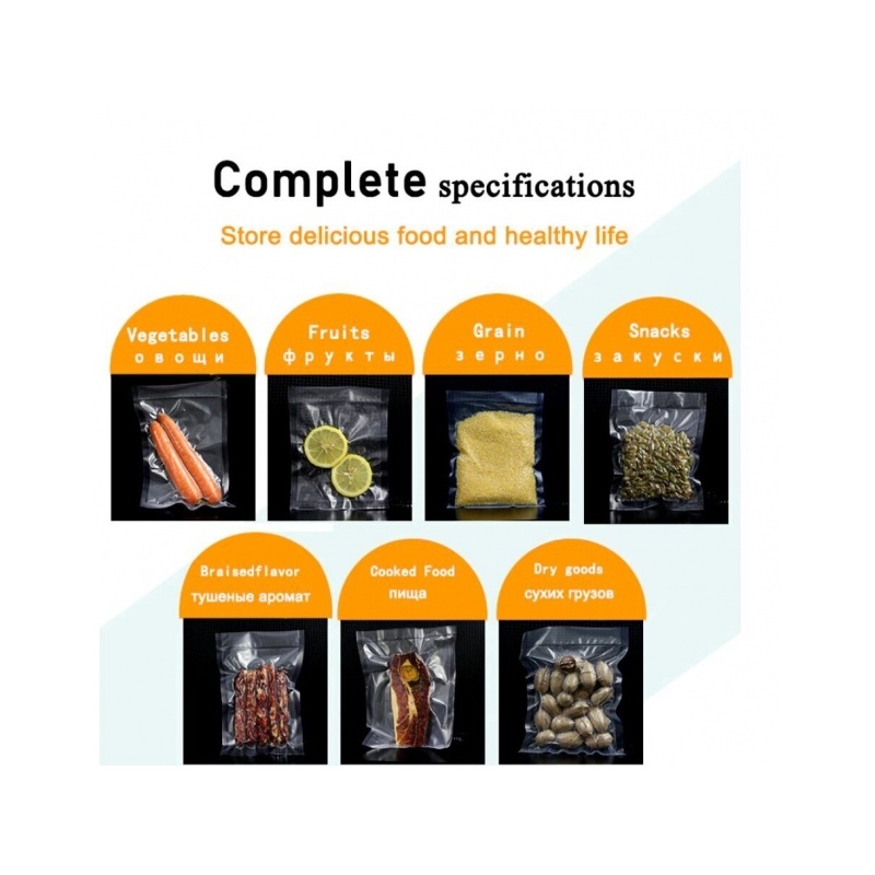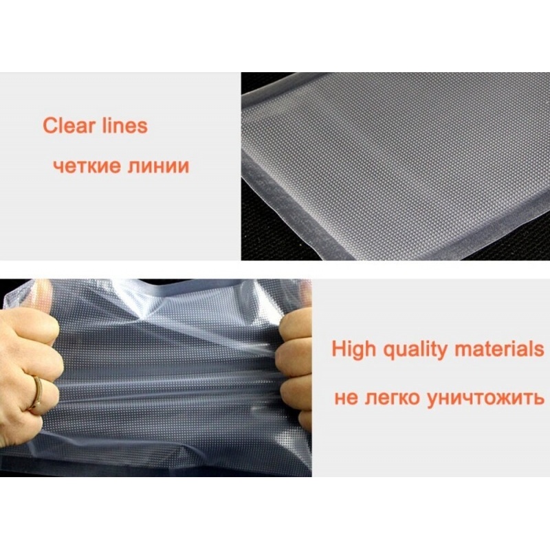 Korkea laatu: Kaksi kerrosta 4 mil ylivahvoja vakuumipakkauksia, joissa on uritettu kanava ilman poistamiseksi, kestäviä kuumuudelle (+110°C) ja kylmyydelle (-45°C), sopii käytettäväksi pakastimessa tai mikroaaltouunissa.