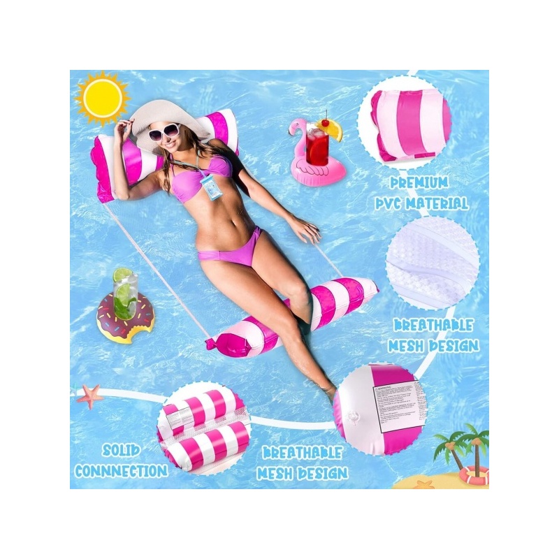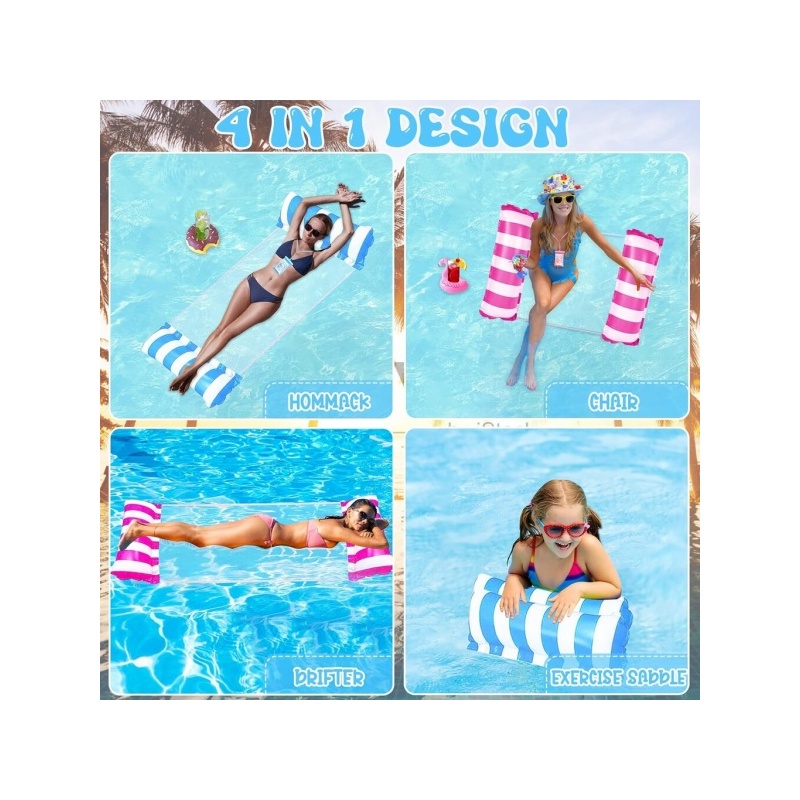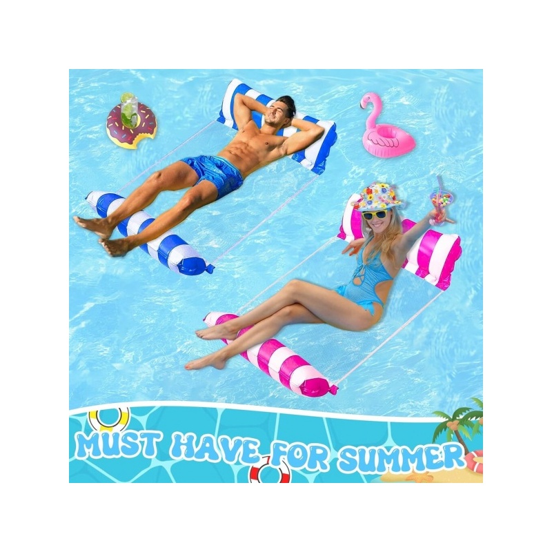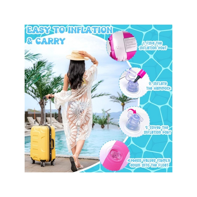 4 in 1 -malli Tämä monipuolinen puhallettava uima-allaskelluke on 4 in 1 -malli, ja sitä voidaan käyttää paitsi riippumatona, myös lepotuolina, kellukkeena ja urheilusatulana, joten se on ihanteellinen puhallettava vesikelluke. Eri käyttötarkoitukset tarjoavat erilaisia nautintoja. Tämä puhallettava riippumatto sopii myös ihmisille, jotka eivät osaa uida, voit rentoutua tai makuulla ja nauttia vedestä perheen ja ystävien kanssa.