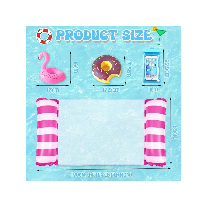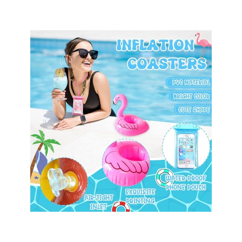 Setti, jossa 2 puhallettavaa allasriippumattoa, juomatelineet ja puhelinkotelot
