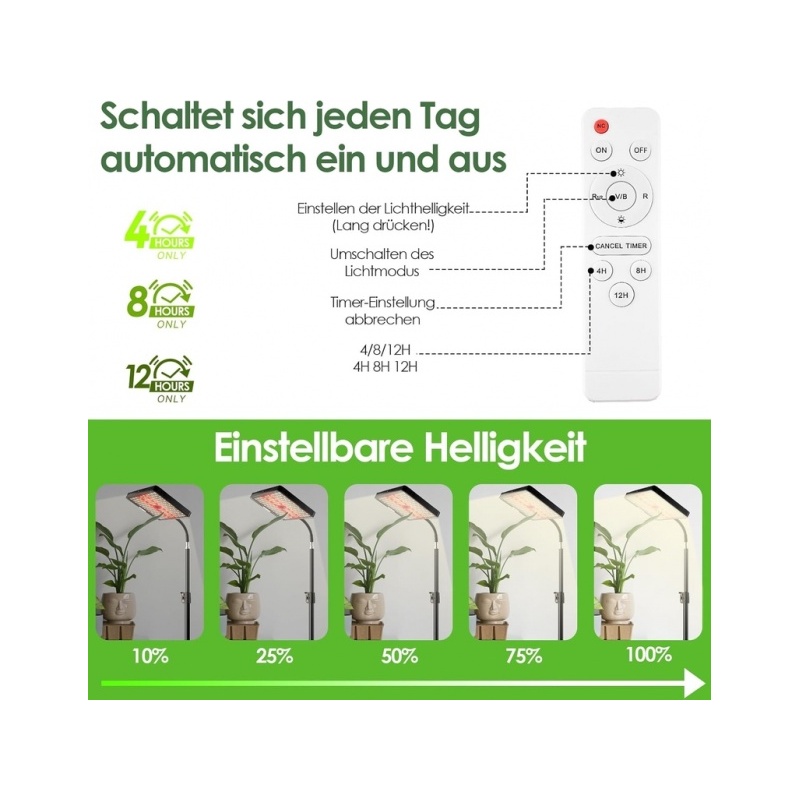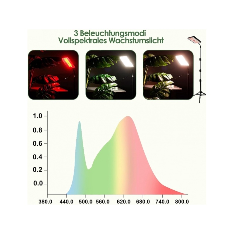 Säädettävä kirkkaus ja kolme tilaa: lamppu tarjoaa kolme tilaa (punainen valo, päivänvalo ja yhdistelmävalo). Kirkkaus voidaan säätää kasvien kasvuvaiheen mukaan (pitkä painallus kaukosäätimessä!).