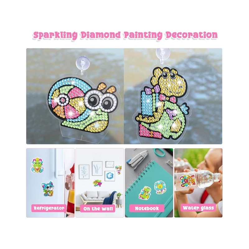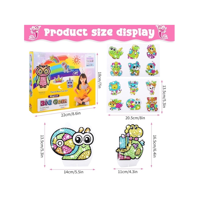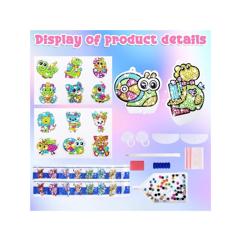 Pakkaus sisältää: 12 tarraa, 2 auringonsieppaajaa, 2 auringonsieppaajatelinettä, 2 imukuppikoukkua, 1 timanttimaalauskynä, 1 alusta, 1 kynäteline, 1 vahaneliö, itsesulkeutuva pussi ja satoja värikkäitä timantteja. Lasten timanttimaalaussarjat ovat erittäin suosittuja askartelupakkauksia lasten keskuudessa ja ovat ihanteellisia askarteluleluja 4-, 5-, 6-, 7- ja 8-vuotiaille tytöille ja pojille. Valittavana on 4 yhteensopivaa tyyliä.