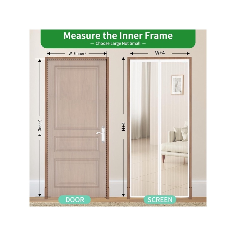 Täiuslik sobivus teie uksele: magnetiline sääsevõrk mõõtmetega 80 × 210 cm (L × K) sobib täis-, liug-, metalli- või puitustele, mille siseraami mõõtmed on kuni 76 × 206 cm. Märkus: suurust ei saa kohandada – valige sobiv suurus. Kahtluse korral võtke meiega ühendust!