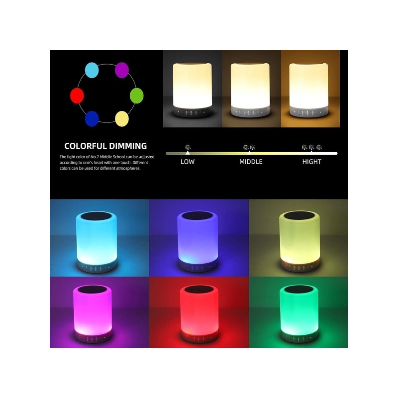 Puutevalgustus: 3 heledustaset, sooja valgustuse režiim, vajutades lihtsalt kõlarite võre. Lülitage koheselt värvilise valgustuse režiimile, vajutades ja hoides all kõlarite võrku. Värvilisel LED-teemal on 6 värvimuutusrežiimi ja see vilgub muusika taktis Bluetooth-ühenduse ja heli voogesituse kaudu.