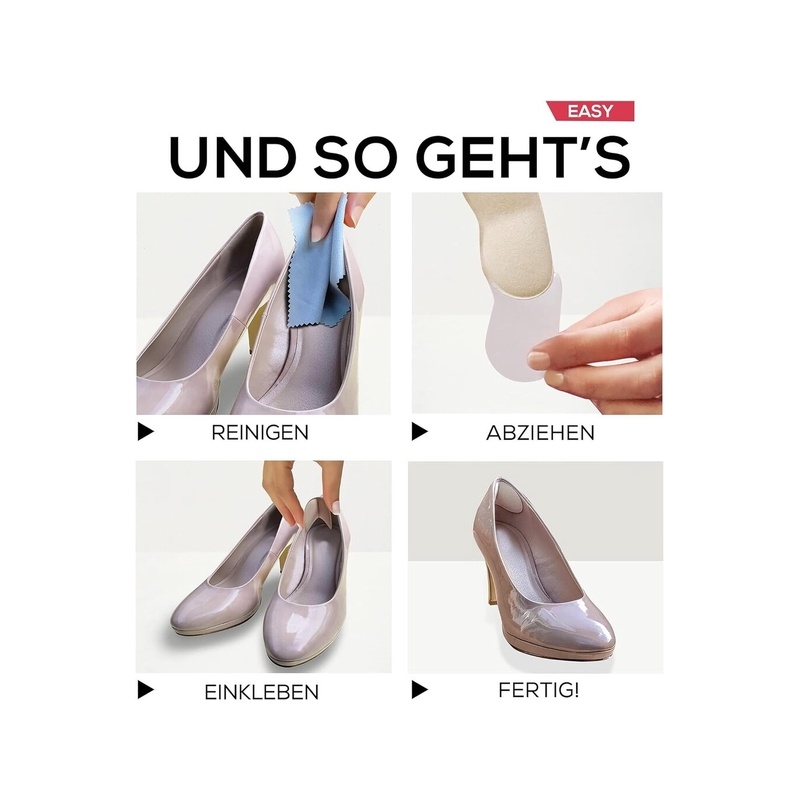 Lihtne kasutada: lihtsalt eemaldage kannapadja tagakülg ja kinnitage kleepuv osa kinga külge. Isekleepuv tehnoloogia hoiab teie sisetallad terve päeva kindlalt paigal.
