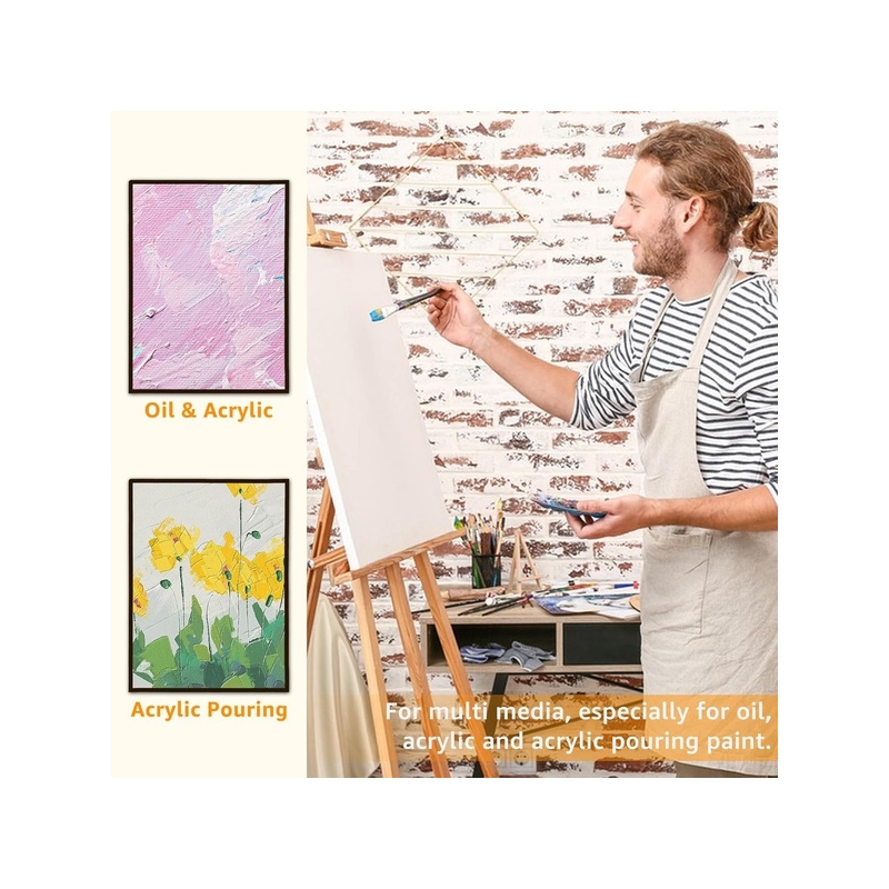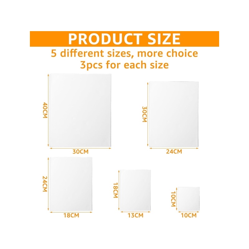 Toote üksikasjad: Komplekt sisaldab 5 erinevas suuruses lõuendiraami – 10×10 cm, 13×18 cm, 18×24 cm, 24×30 cm ja 30×40 cm, iga suurust 3 tk. Kokku saad 15 valget lõuendit, mis katavad igapäevased loomingulised vajadused.