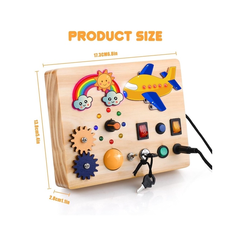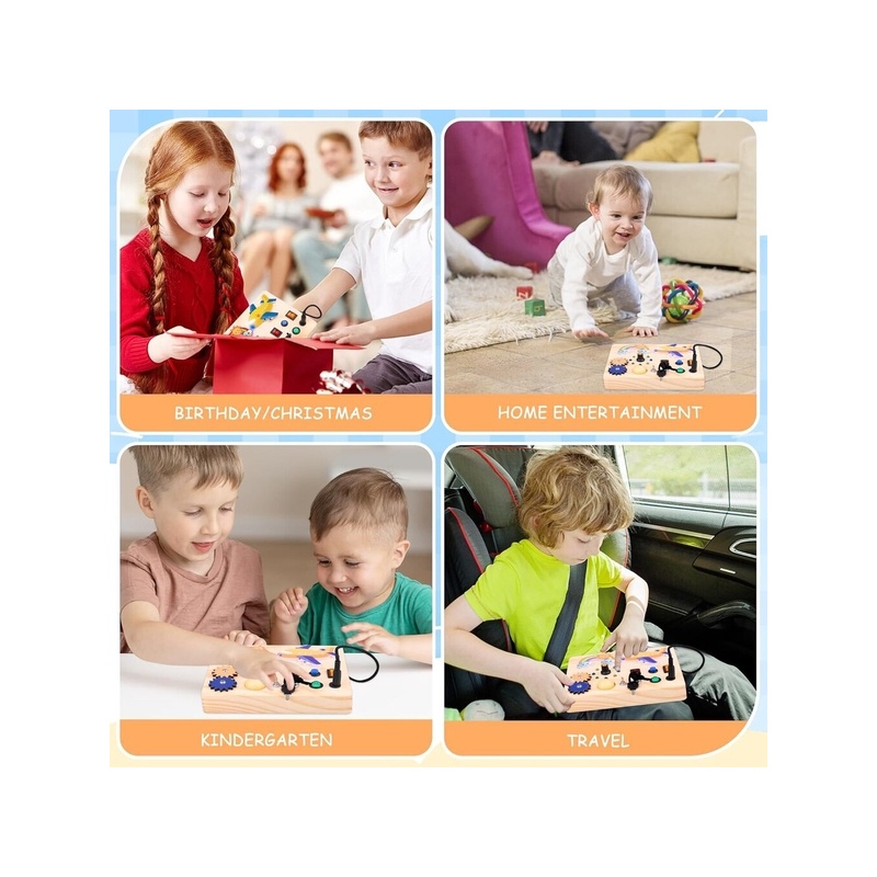 【SENSORMÄNGUASI】 Selle mängulaua puidust sensoorsed mänguasjad on varustatud erinevate puute-, valgus- ja värvianduritega, mis võivad stimuleerida puudutust, nägemist, sensoorset stimulatsiooni ja palju muud. See lastele mõeldud kaks-ühes hariv mänguasi võimaldab teil ühendada õppimise ja mängimise. Aidake lastel oma mõtlemis- ja käelisi oskusi treenides ära tunda erinevaid värve ja funktsioone.