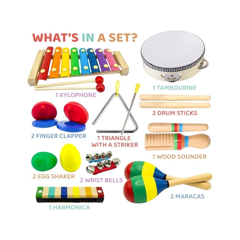 puust muusikainstrumendi komplekt lastele sisaldab: 1 suupill, 1 ksülofon, 2 marakat, 2 kõristiti, 2 sõrmeklappi, tamburiin, trummipulgad, 2 kellukest, 1 triangel