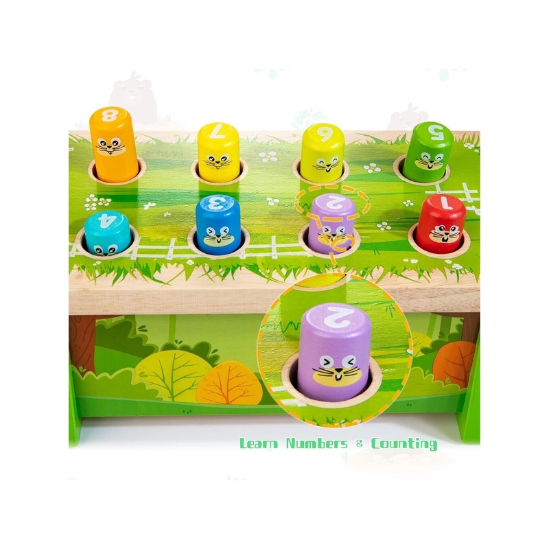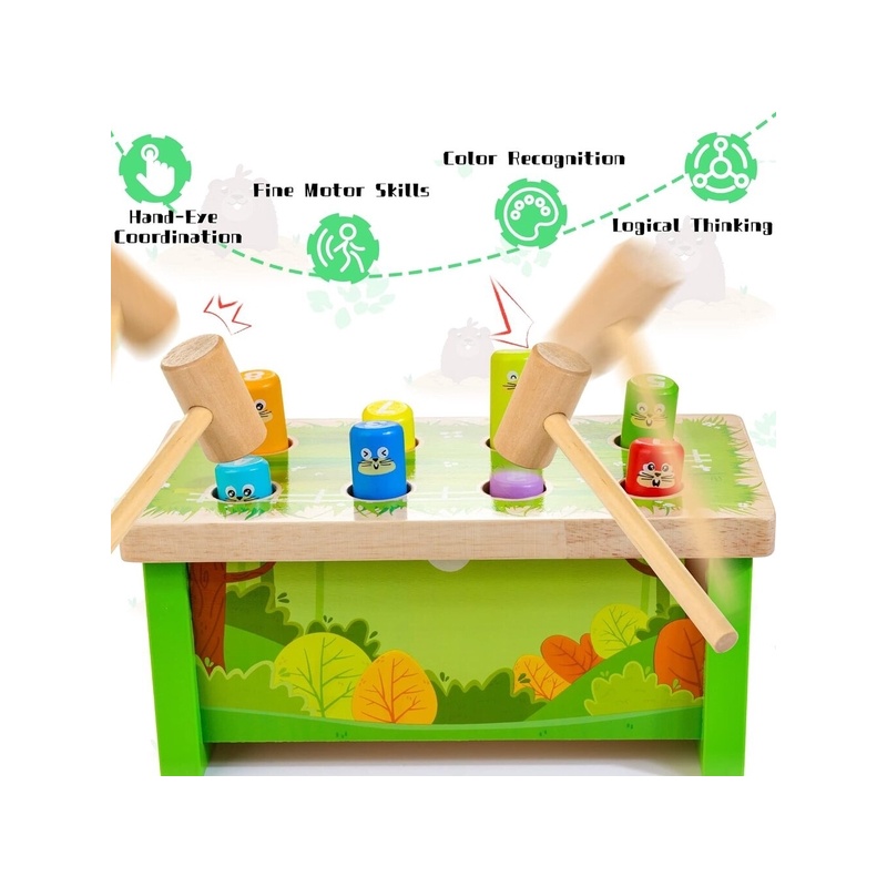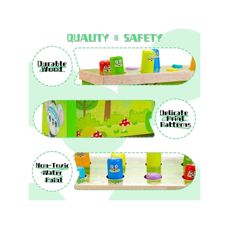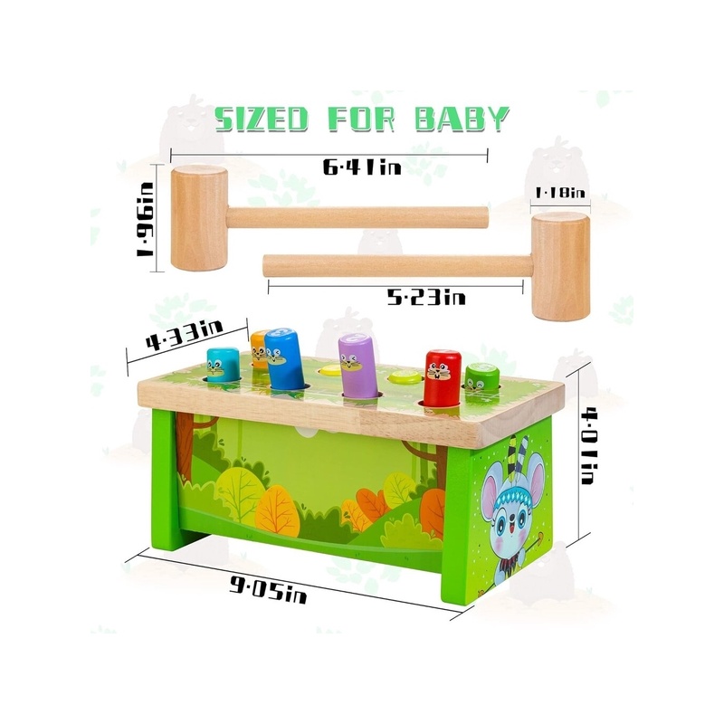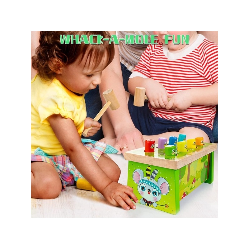 Armas haamermänguasi: see puidust haamriga mänguasi on Whack-a-Mole'i klassikaline väljaanne. Kui sisseehitatud värvilised mutid tulevad ja lähevad kaunilt kujundatud pingil, näidates kordamööda oma armsaid ja naeratavaid nägusid, saavad lapsed lõbusalt möllata.