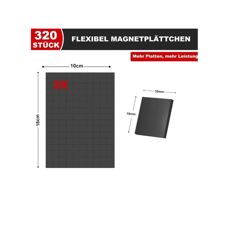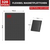 320 tükki painduvaid magnetplaate ilma liimita. Iga tasapinnalise magneti suurus on 10 x 10 mm ja talub kuni 60 g/cm2 koormust. Raskemate esemete jaoks lisage mitu või enam magnetpunkti.