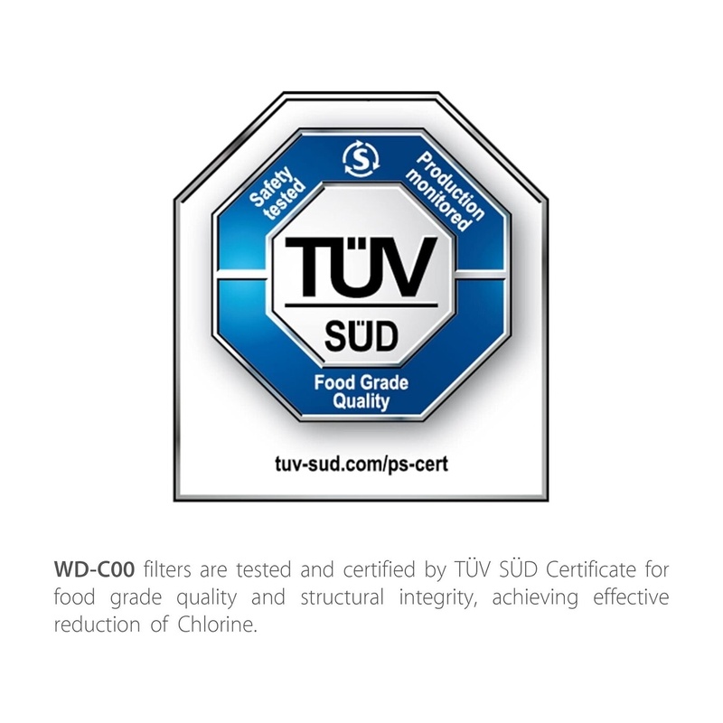 TÜV SÜD poolt sertifitseeritud kloorisisalduse vähendamiseks vees.