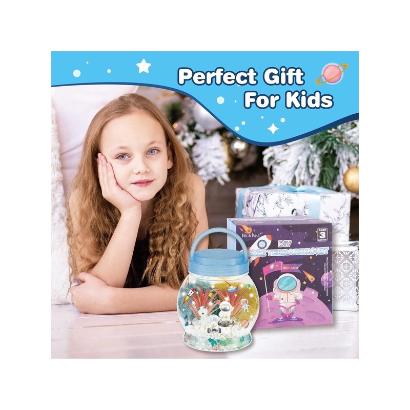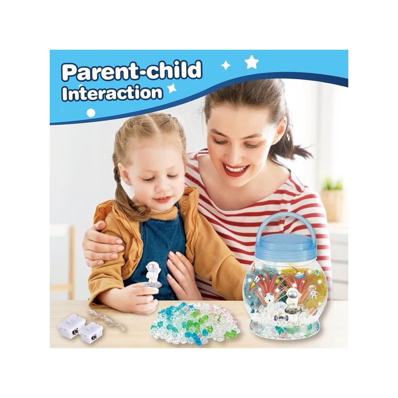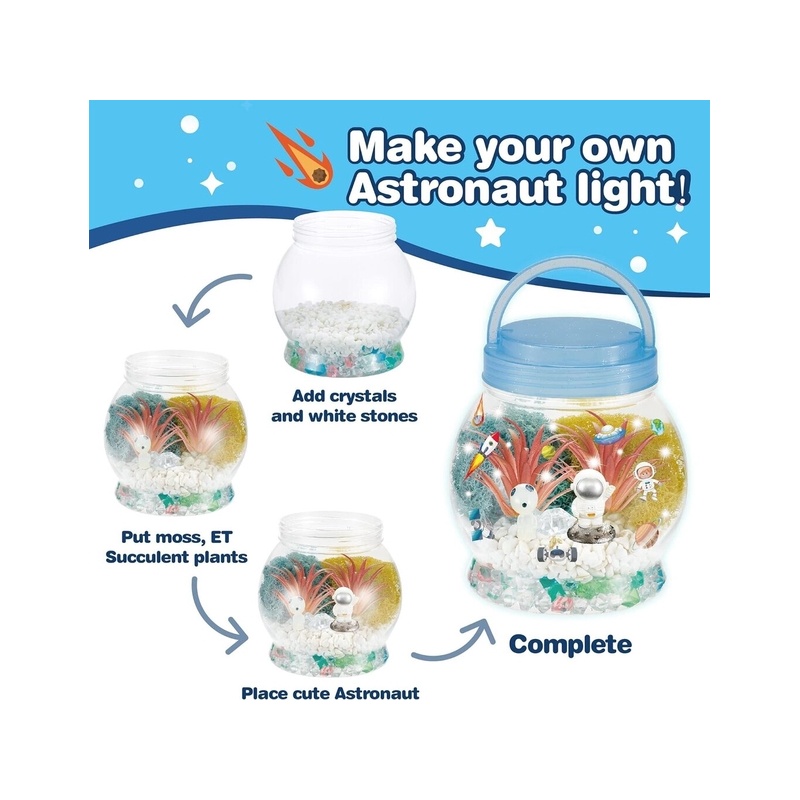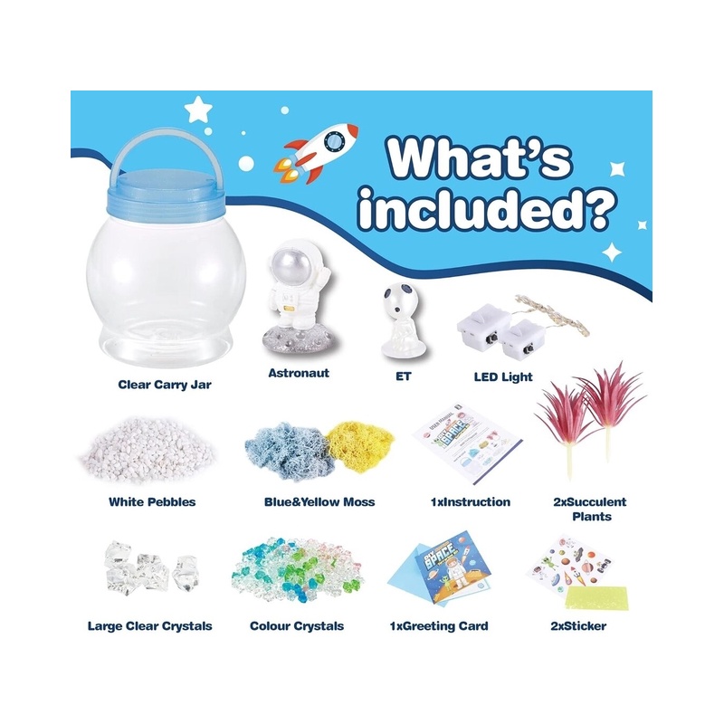 【В комплекте】1 прозрачная банка для переноски, 1 синий мох, 1 желтый мох, 2 суккулентных растения, 1 цветные кристаллы, 1 белая галька, 1 большие прозрачные кристаллы, 2 х Светодиодный светильник, 1 космонавт, 1 инопланетянин, 2 наклейки, 1 инструкция, 1 поздравительная открытка